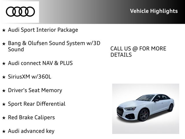 Certified. Arkona White 2024 Audi S4 3.0T Premium Plus quattro quattro 8-Speed Automatic 3.0L TFSI V6 DOHC RECENT HOFFMAN TRADE, CLEAN CAR FAX...NO ACCIDENTS, AUDI CERTIFIED, SERVICE RECORDS AVAILABLE, ONE OWNER, NAVIGATION GPS NAV, SUNROOF MOONROOF, REMAINDER OF FACTORY WARRANTY, 6 MONTH OR 6,000 POWERTRAIN WARRANTY, 2 Rear USB Charging Ports, Alarm System w/Motion Sensors, Audi advanced key, Audi connect NAV & PLUS, Audi Side Assist w/Pre Sense Rear, Audi Sport Interior Package, Audi Virtual Cockpit Plus, Auto-Dimming Exterior Mirrors w/Memory, Bang & Olufsen Sound System w/3D Sound, Black Audi Rings & Badges, Black Exterior Mirror Housings & Exhaust Tips, Black Exterior Trim, Black Optic Plus Package, Black Side Sill Blades & Rear Lip Spoiler, Convenience Package, Driver's Seat Memory, Fine Nappa Leather Seating Surfaces, Leatherette Covered Center Console & Door Armrests, MMI Navigation Plus, Navigation Package, Navigation System, Power Folding Exterior Mirrors, Premium Plus Package, Red Brake Calipers, S Sport Package, SiriusXM w/360L, Sport Adaptive Damping Suspension, Sport Rear Differential, Top View Camera System, Traffic Sign Recognition, Wheels: 19" 5-V-Spoke-Star Design, Wireless Phone Charging Pad.
