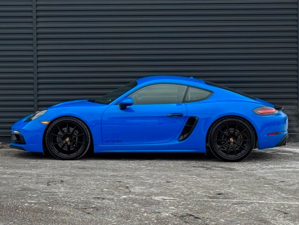 18-Way Adaptive Sport Seats Plus with Memory Package, 2-Way Sport Seats Plus, 4-Wheel Disc Brakes, 8 Speakers, Adaptive Cruise Control (ACC), Adaptive suspension, Air Conditioning, Alloy wheels, AM/FM radio: SiriusXM, Apple CarPlay, Auto-dimming door mirrors, Auto-dimming Rear-View mirror, Automatic temperature control, Brake assist, Brake Calipers in High Gloss Black, Bumpers: body-color, Burmester High-End Surround Sound System, Delay-off headlights, Door Handles in High Gloss Black, Driver door bin, Driver vanity mirror, Dual front impact airbags, Dual front side impact airbags, Electric Steering Column, Electronic Stability Control, Four wheel independent suspension, Front anti-roll bar, Front Bucket Seats, Front Center Armrest, Front dual zone A/C, Front reading lights, Fully automatic headlights, Garage door transmitter: HomeLink, Headlight cleaning, Heated door mirrors, Heated front and rear seats, Heated Multifunction Steering Wheel, High intensity discharge headlights: Bi-Xenon, Illuminated entry, Instrument Dials in White, Interior Trim in Black Brushed Aluminum, Knee airbag, Lane Change Assist (LCA), Leather/Race-Tex Seat Trim, LED Headlights with Porsche Dynamic Light System, Light Design Package, Low tire pressure warning, Navigation with Porsche Connect, Occupant sensing airbag, Outside temperature display, Overhead airbag, Park Assist (Front & Rear) Incl. Surround View, Passenger door bin, Passenger vanity mirror, Pedals and Footrest in Aluminum, Porsche Ceramic Composite Brake (PCCB), Porsche Communication Management, Power door mirrors, Power driver seat, Power Folding Exterior Mirrors with Courtesy Lighting, Power passenger seat, Power steering Plus, Power windows, Radio data system, Rain sensing wipers, Rear anti-roll bar, Rear window defroster, Rear Wing in High Gloss Black, Remote keyless entry, Seat Belts in Shark Blue, Seat Ventilation, Security system, Sound Package Plus w/8 Loudspeakers, Speed control, Spoiler, Sport Chrono Stopwatch Dial in White, Sport steering wheel, Tachometer, Telescoping steering wheel, Tilt steering wheel, Traction control, Trip computer, Variably intermittent wipers, Wheels: 20" 718 Sport in Satin Black. Clean CARFAX. Certified. Shark Blue 2025 Porsche 718 Cayman GTS RWD 7-Speed Porsche Doppelkupplung (PDK) 4.0L H6 DOHC 24V LEV3-LEV160 394hp