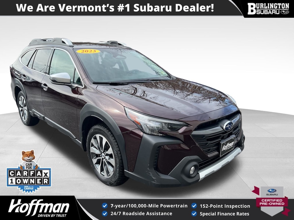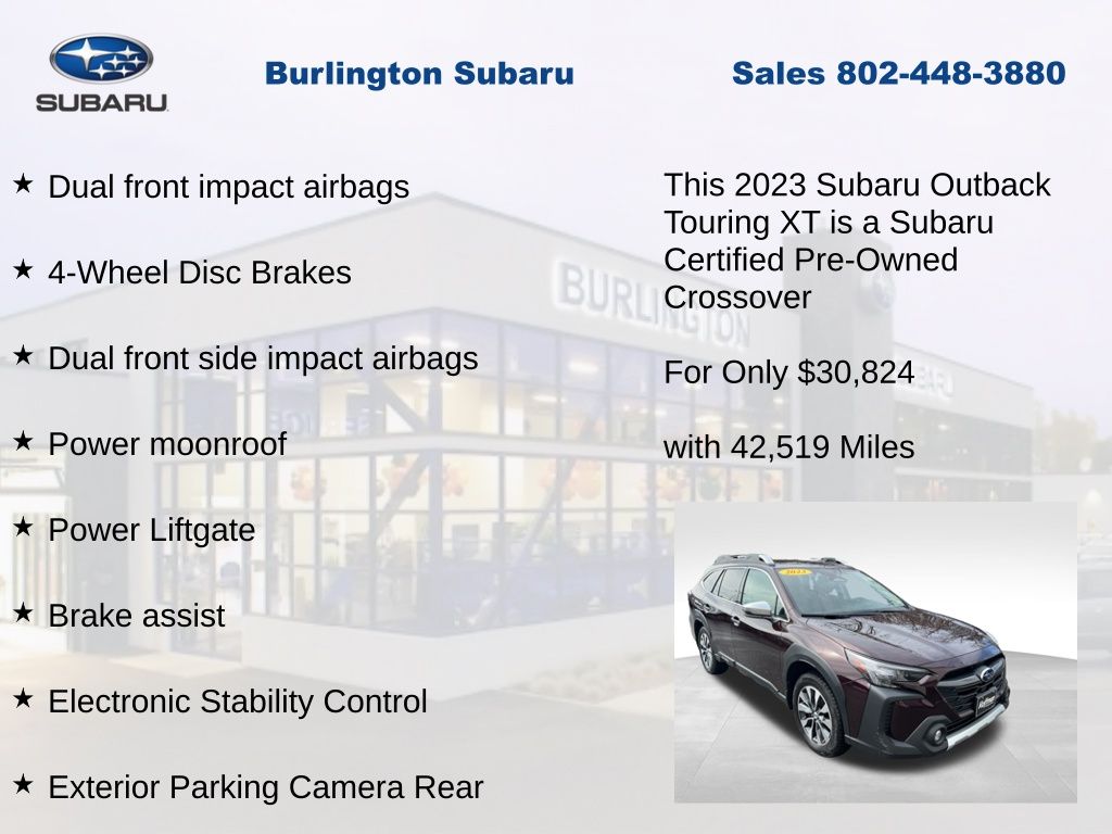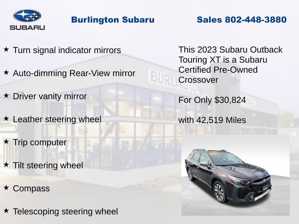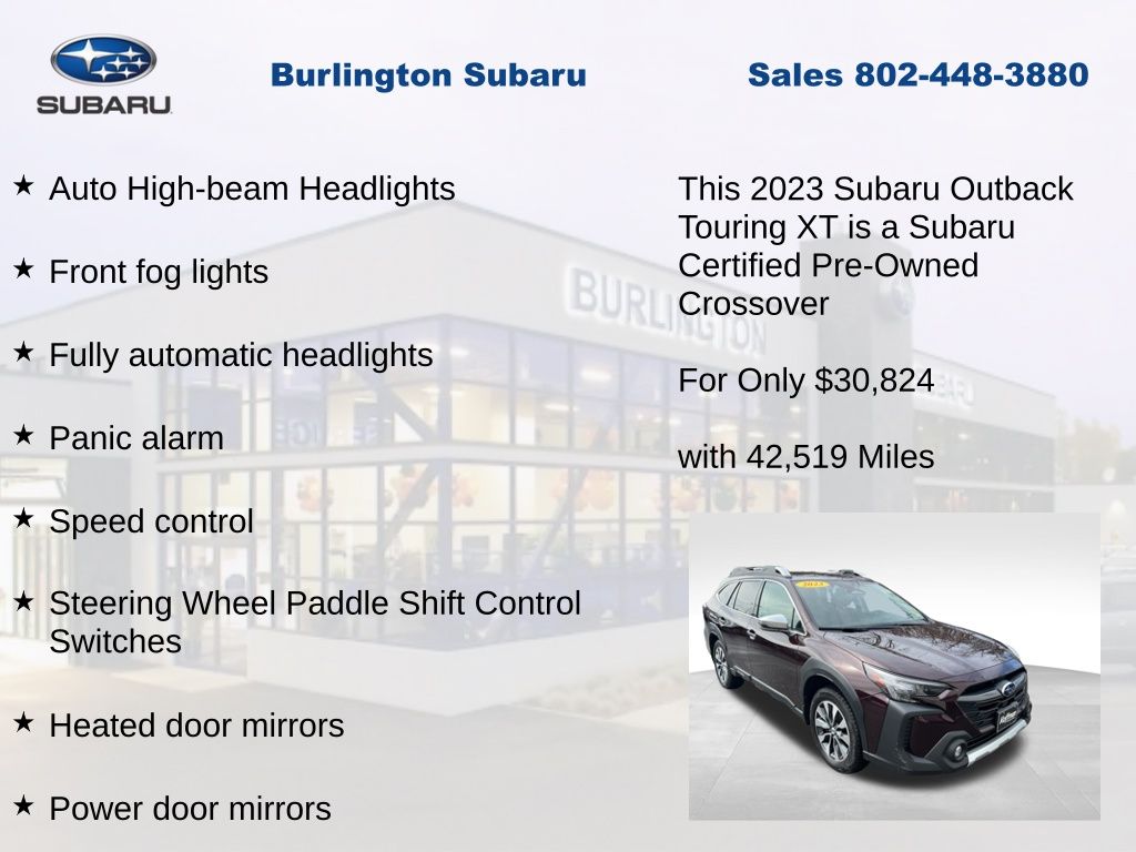 CARFAX One-Owner. Clean CARFAX. Subaru Outback Touring XT 2023 Certified. 4-Wheel Disc Brakes, ABS brakes, Air Conditioning, Alloy wheels, AM/FM radio: SiriusXM, Auto High-beam Headlights, Auto-dimming Rear-View mirror, Automatic temperature control, Brake assist, Compass, Driver vanity mirror, Dual front impact airbags, Dual front side impact airbags, Electronic Stability Control, Emergency communication system: STARLINK Safety Plus (3-year free trial), Exterior Parking Camera Rear, Four wheel independent suspension, Front dual zone A/C, Front fog lights, Front reading lights, Fully automatic headlights, Garage door transmitter: HomeLink, Heated & Ventilated Front Bucket Seats, Heated door mirrors, Heated steering wheel, HVAC memory, Illuminated entry, Knee airbag, Leather Shift Knob, Leather steering wheel, Low tire pressure warning, Memory seat, Navigation System, Occupant sensing airbag, Outside temperature display, Overhead airbag, Panic alarm, Passenger vanity mirror, Perforated Nappa Leather-Trimmed Upholstery, Power door mirrors, Power driver seat, Power Liftgate, Power moonroof, Power passenger seat, Power steering, Power windows, Radio: Subaru STARLINK 11.6" Multimedia Nav System, Rear window defroster, Rear window wiper, Remote CD player, Remote keyless entry, Speed control, Speed-sensing steering, Split folding rear seat, Steering wheel mounted audio controls, Steering Wheel Paddle Shift Control Switches, Tachometer, Telescoping steering wheel, Tilt steering wheel, Traction control, Trip computer, Turn signal indicator mirrors, Variably intermittent wipers, Ventilated front seats.