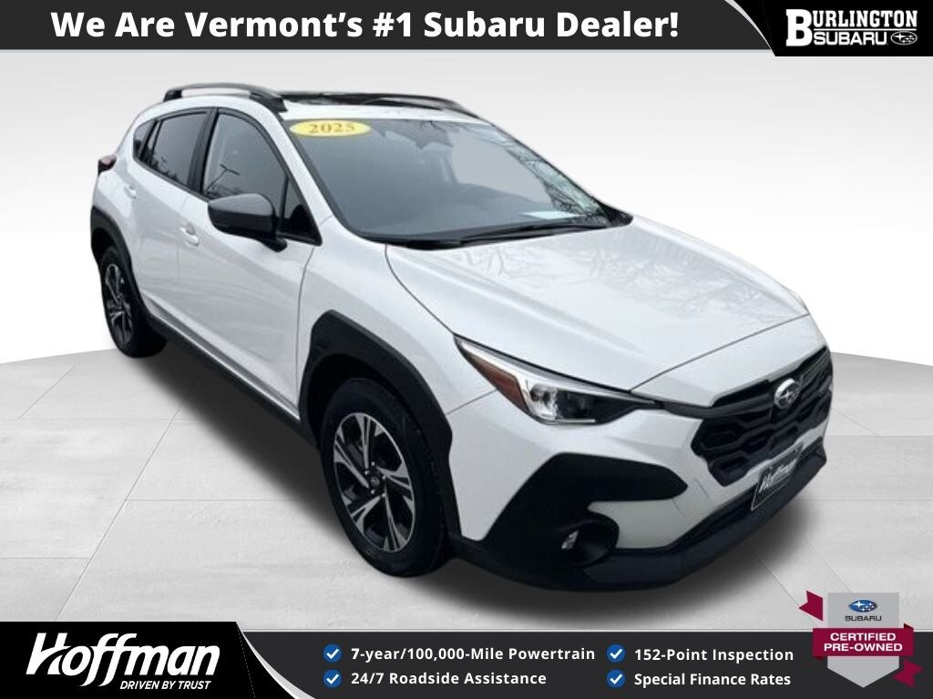Clean CARFAX. Subaru Crosstrek Premium 2025 Certified. 10-Way Power Driver's Seat, 4-Wheel Disc Brakes, ABS brakes, Air Conditioning, All-Weather Package, Alloy wheels, AM/FM radio: SiriusXM, Anti-whiplash front head restraints, Auto High-beam Headlights, Automatic temperature control, Blind Spot Detection (BSD), Brake assist, BSD/RCTA & All Wthr Pkg & Pwr Dr. Seat & Pwr Moonrf, Driver vanity mirror, Dual front impact airbags, Dual front side impact airbags, Dual-Mode Heated Front Seats, Electronic Stability Control, Emergency communication system, Exterior Parking Camera Rear, Four wheel independent suspension, Front Bucket Seats, Front dual zone A/C, Front fog lights, Front reading lights, Fully automatic headlights, Heated Power Exterior Mirrors, Illuminated entry, Knee airbag, Low tire pressure warning, Occupant sensing airbag, Outside temperature display, Overhead airbag, Panic alarm, Passenger vanity mirror, Power door mirrors, Power Moonroof, Power steering, Power windows, Radio: Subaru 11.6" Multimedia Plus System, Rear Cross-Traffic Alert (RCTA) System, Rear window defroster, Rear window wiper, Remote keyless entry, Speed control, Speed-sensing steering, Split folding rear seat, Steering wheel mounted audio controls, Tachometer, Telescoping steering wheel, Tilt steering wheel, Traction control, Trip computer, Turn signal indicator mirrors, Variably intermittent wipers, Windshield De-Icer Wipers. Odometer is 743 miles below market average!