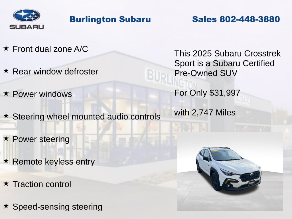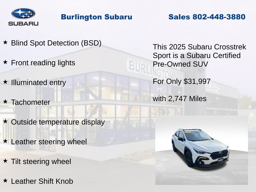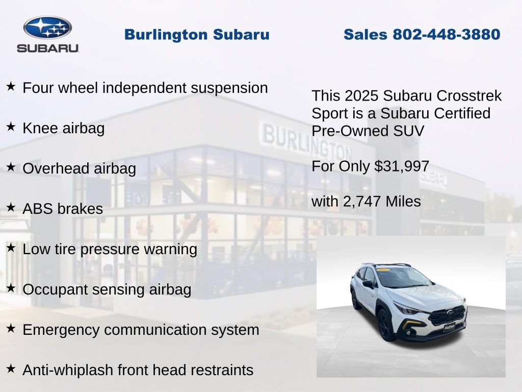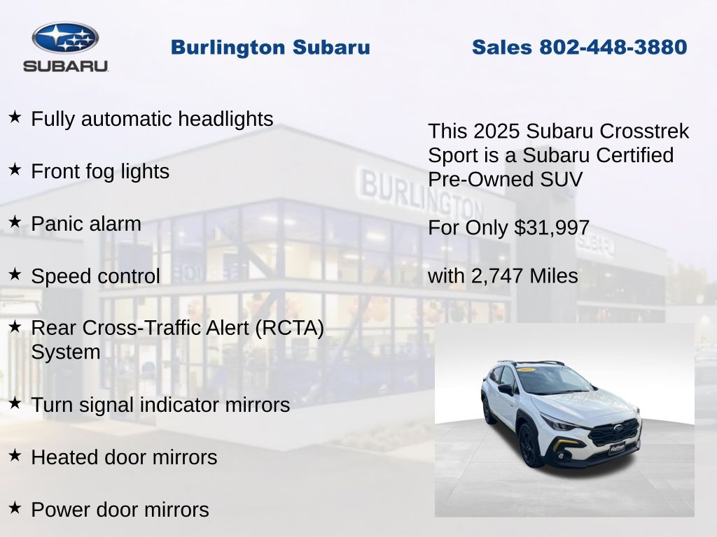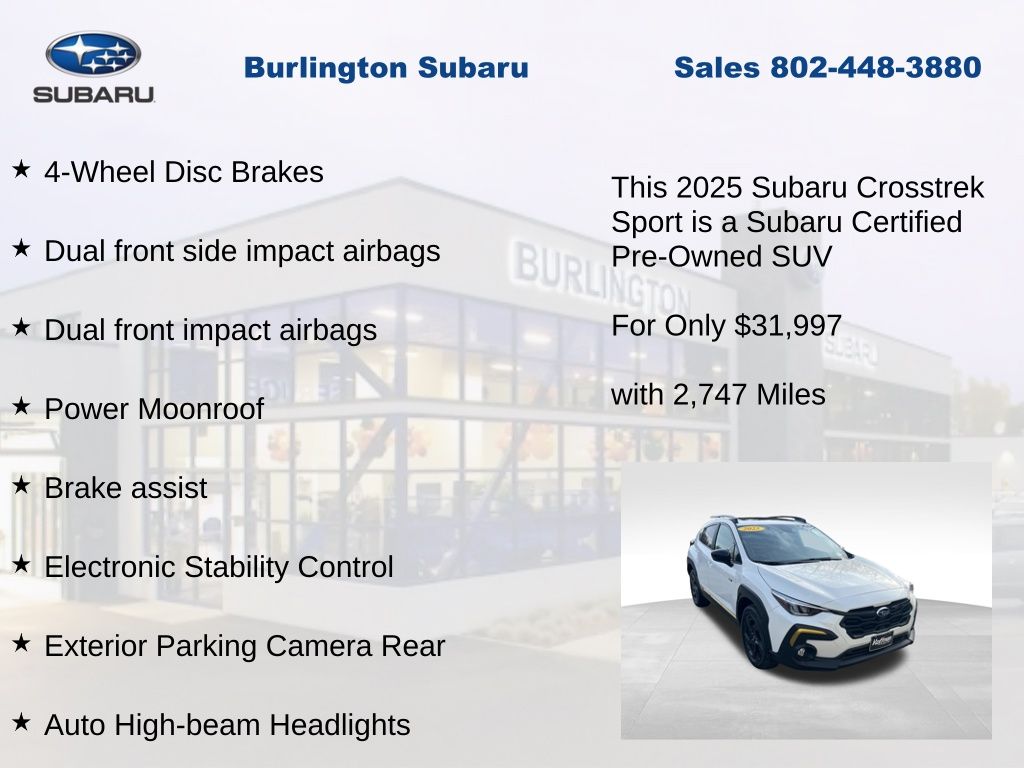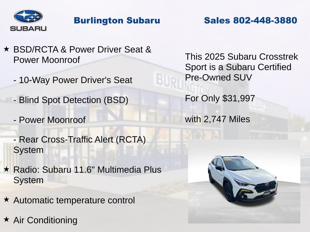 CARFAX One-Owner. Clean CARFAX. Subaru Crosstrek Sport 2025 Certified. 10-Way Power Driver's Seat, 4-Wheel Disc Brakes, ABS brakes, Air Conditioning, Alloy wheels, Anti-whiplash front head restraints, Auto High-beam Headlights, Automatic temperature control, Blind Spot Detection (BSD), Brake assist, BSD/RCTA & Power Driver Seat & Power Moonroof, Driver vanity mirror, Dual front impact airbags, Dual front side impact airbags, Electronic Stability Control, Emergency communication system, Exterior Parking Camera Rear, Four wheel independent suspension, Front dual zone A/C, Front fog lights, Front reading lights, Fully automatic headlights, Heated door mirrors, Heated Front Bucket Seats, Illuminated entry, Knee airbag, Leather Shift Knob, Leather steering wheel, Low tire pressure warning, Occupant sensing airbag, Outside temperature display, Overhead airbag, Panic alarm, Passenger vanity mirror, Power door mirrors, Power Moonroof, Power steering, Power windows, Radio: Subaru 11.6" Multimedia Plus System, Rear Cross-Traffic Alert (RCTA) System, Rear window defroster, Rear window wiper, Remote keyless entry, Speed control, Speed-sensing steering, Split folding rear seat, Steering wheel mounted audio controls, Tachometer, Telescoping steering wheel, Tilt steering wheel, Traction control, Trip computer, Turn signal indicator mirrors, Variably intermittent wipers. Odometer is 906 miles below market average!