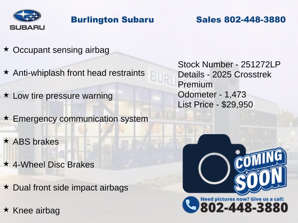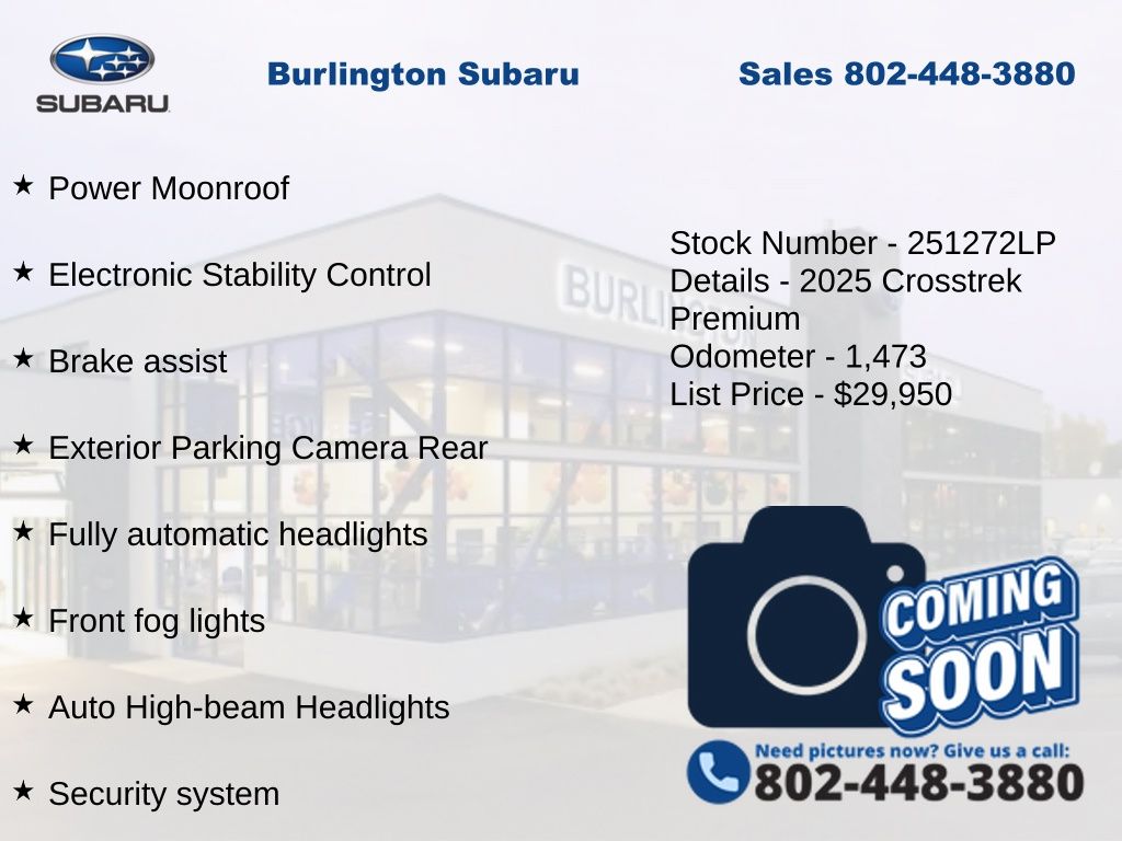 Clean CARFAX. Subaru Crosstrek Premium 2025 10-Way Power Driver's Seat, 4-Wheel Disc Brakes, ABS brakes, Air Conditioning, All-Weather Package, Alloy wheels, Anti-whiplash front head restraints, Auto High-beam Headlights, Automatic temperature control, Blind Spot Detection (BSD), Brake assist, BSD/RCTA & All Wthr Pkg & Pwr Dr. Seat & Pwr Moonrf, Driver vanity mirror, Dual front impact airbags, Dual front side impact airbags, Dual-Mode Heated Front Seats, Electronic Stability Control, Emergency communication system, Exterior Parking Camera Rear, Four wheel independent suspension, Front Bucket Seats, Front dual zone A/C, Front fog lights, Front reading lights, Fully automatic headlights, Heated Power Exterior Mirrors, Illuminated entry, Knee airbag, Low tire pressure warning, Occupant sensing airbag, Outside temperature display, Overhead airbag, Passenger vanity mirror, Power door mirrors, Power Moonroof, Power steering, Power windows, Radio: Subaru 11.6" Multimedia Plus System, Rear Cross-Traffic Alert (RCTA) System, Rear window defroster, Rear window wiper, Remote keyless entry, Security system, Speed control, Speed-sensing steering, Split folding rear seat, Steering wheel mounted audio controls, Tachometer, Telescoping steering wheel, Tilt steering wheel, Traction control, Trip computer, Turn signal indicator mirrors, Variably intermittent wipers, Windshield De-Icer Wipers. Odometer is 2531 miles below market average!