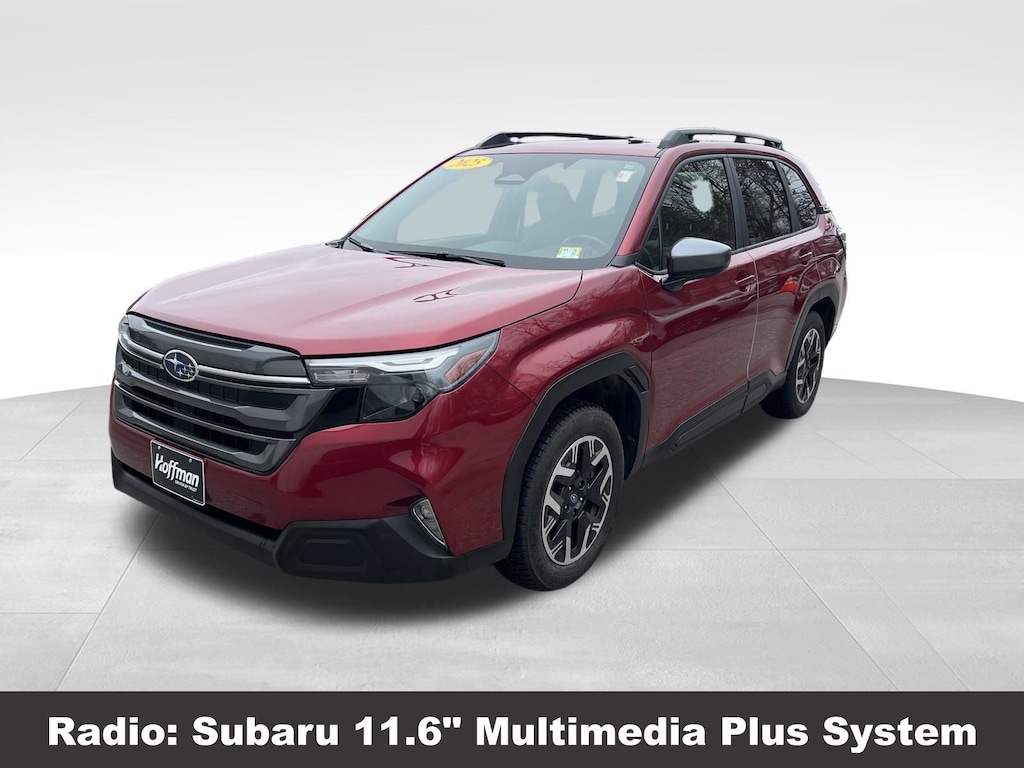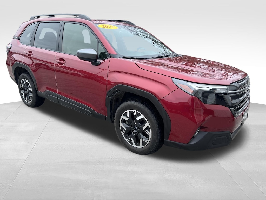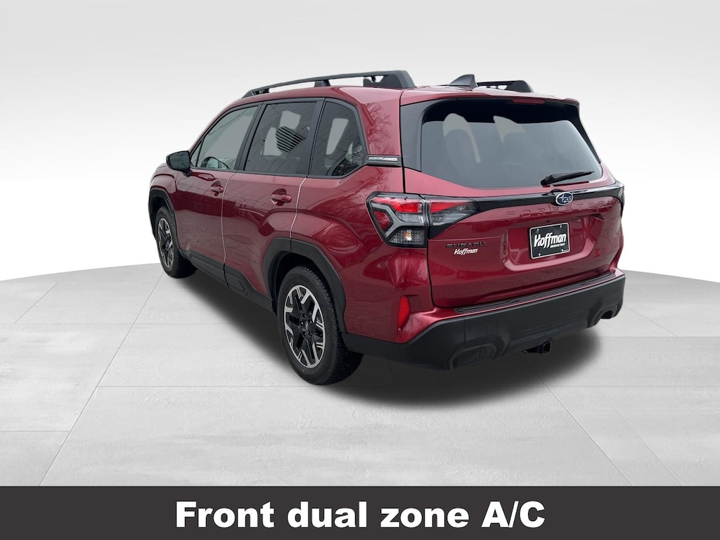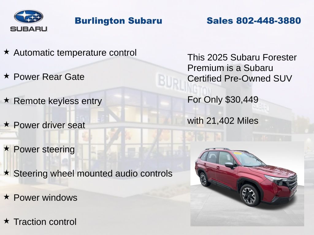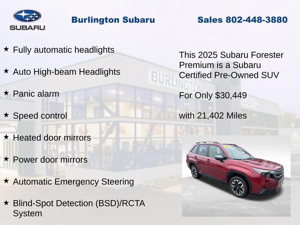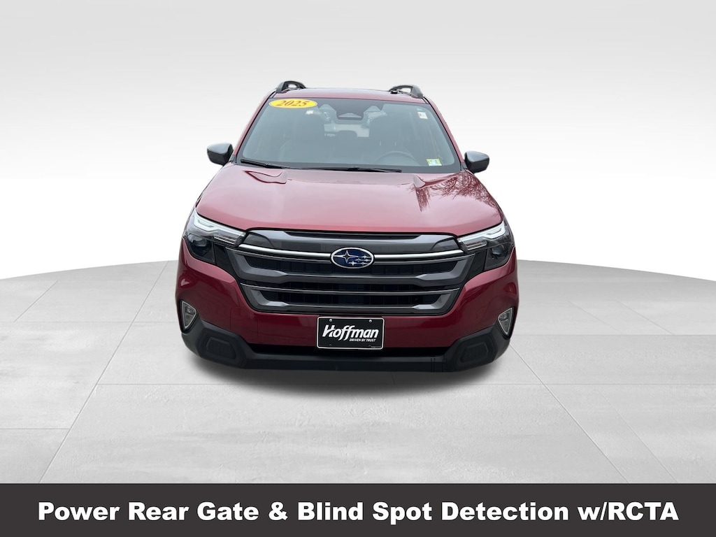 CARFAX One-Owner. Clean CARFAX. Subaru Forester Premium 2025 Certified. 4-Wheel Disc Brakes, ABS brakes, Air Conditioning, Alloy wheels, Anti-whiplash front head restraints, Auto High-beam Headlights, Automatic Emergency Steering, Automatic temperature control, Blind-Spot Detection (BSD)/RCTA System, Brake assist, Driver vanity mirror, Dual front impact airbags, Dual front side impact airbags, Electronic Stability Control, Exterior Parking Camera Rear, Four wheel independent suspension, Front dual zone A/C, Front fog lights, Front reading lights, Fully automatic headlights, Heated door mirrors, Heated Front Bucket Seats, Heated front seats, Illuminated entry, Knee airbag, Leather steering wheel, Low tire pressure warning, Occupant sensing airbag, Outside temperature display, Overhead airbag, Panic alarm, Passenger vanity mirror, Power door mirrors, Power driver seat, Power moonroof: Panoramic, Power Rear Gate, Power Rear Gate & Blind Spot Detection w/RCTA, Power steering, Power windows, Radio: Subaru 11.6" Multimedia Plus System, Rear window defroster, Rear window wiper, Remote keyless entry, Speed control, Speed-sensing steering, Split folding rear seat, Steering wheel mounted audio controls, Tachometer, Telescoping steering wheel, Tilt steering wheel, Traction control, Trip computer, Variably intermittent wipers.