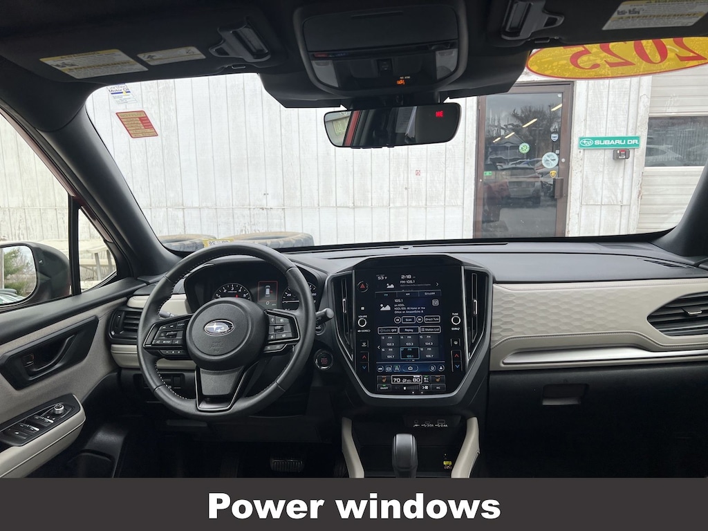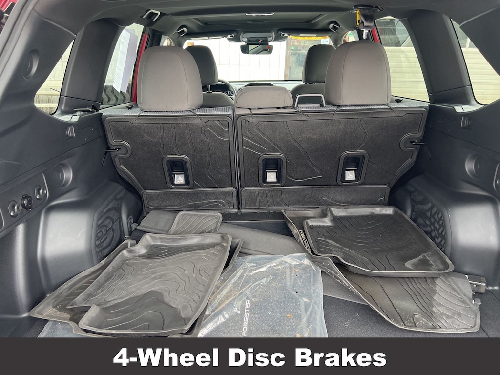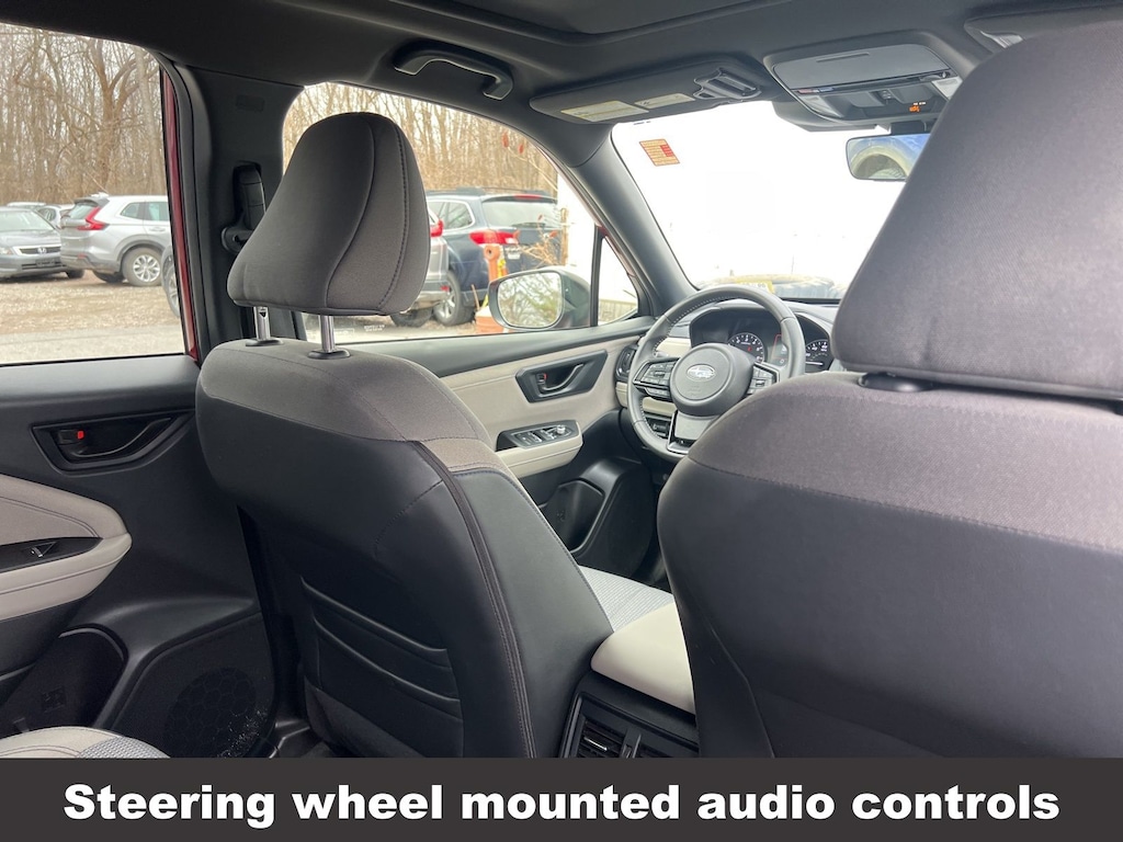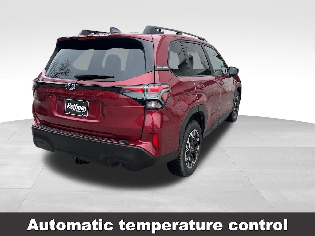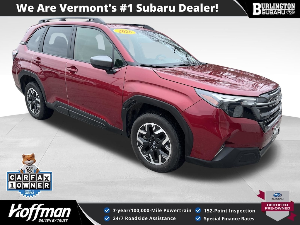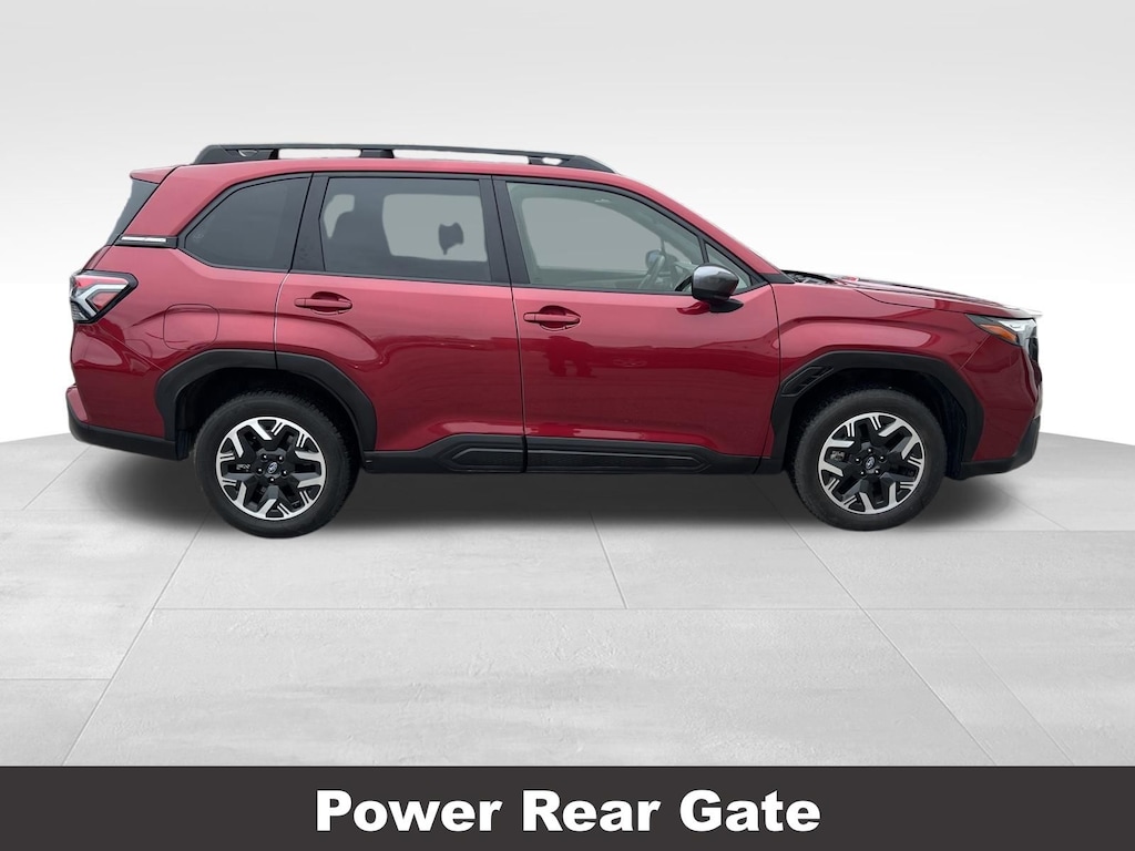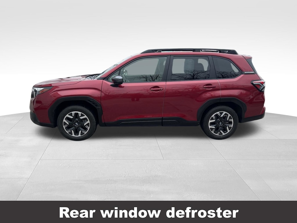 CARFAX One-Owner. Clean CARFAX. Subaru Forester Premium 2025 Certified. 4-Wheel Disc Brakes, ABS brakes, Air Conditioning, Alloy wheels, Anti-whiplash front head restraints, Auto High-beam Headlights, Automatic Emergency Steering, Automatic temperature control, Blind-Spot Detection (BSD)/RCTA System, Brake assist, Driver vanity mirror, Dual front impact airbags, Dual front side impact airbags, Electronic Stability Control, Exterior Parking Camera Rear, Four wheel independent suspension, Front dual zone A/C, Front fog lights, Front reading lights, Fully automatic headlights, Heated door mirrors, Heated Front Bucket Seats, Heated front seats, Illuminated entry, Knee airbag, Leather steering wheel, Low tire pressure warning, Occupant sensing airbag, Outside temperature display, Overhead airbag, Panic alarm, Passenger vanity mirror, Power door mirrors, Power driver seat, Power moonroof: Panoramic, Power Rear Gate, Power Rear Gate & Blind Spot Detection w/RCTA, Power steering, Power windows, Radio: Subaru 11.6" Multimedia Plus System, Rear window defroster, Rear window wiper, Remote keyless entry, Speed control, Speed-sensing steering, Split folding rear seat, Steering wheel mounted audio controls, Tachometer, Telescoping steering wheel, Tilt steering wheel, Traction control, Trip computer, Variably intermittent wipers.