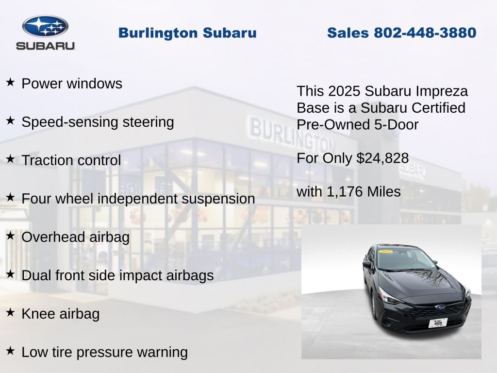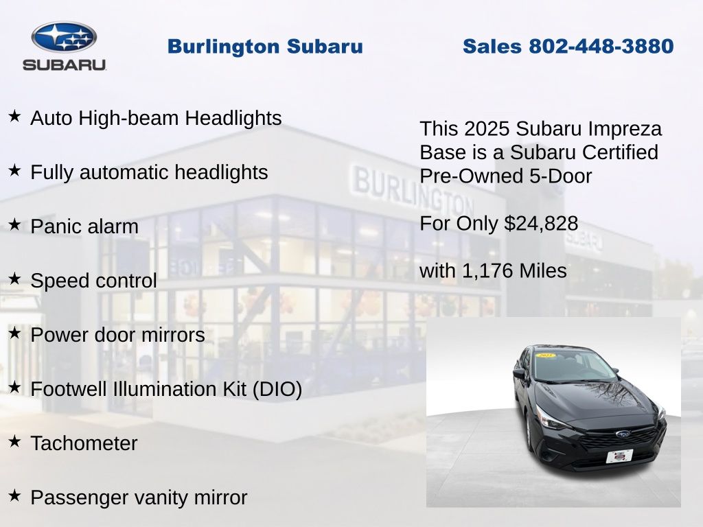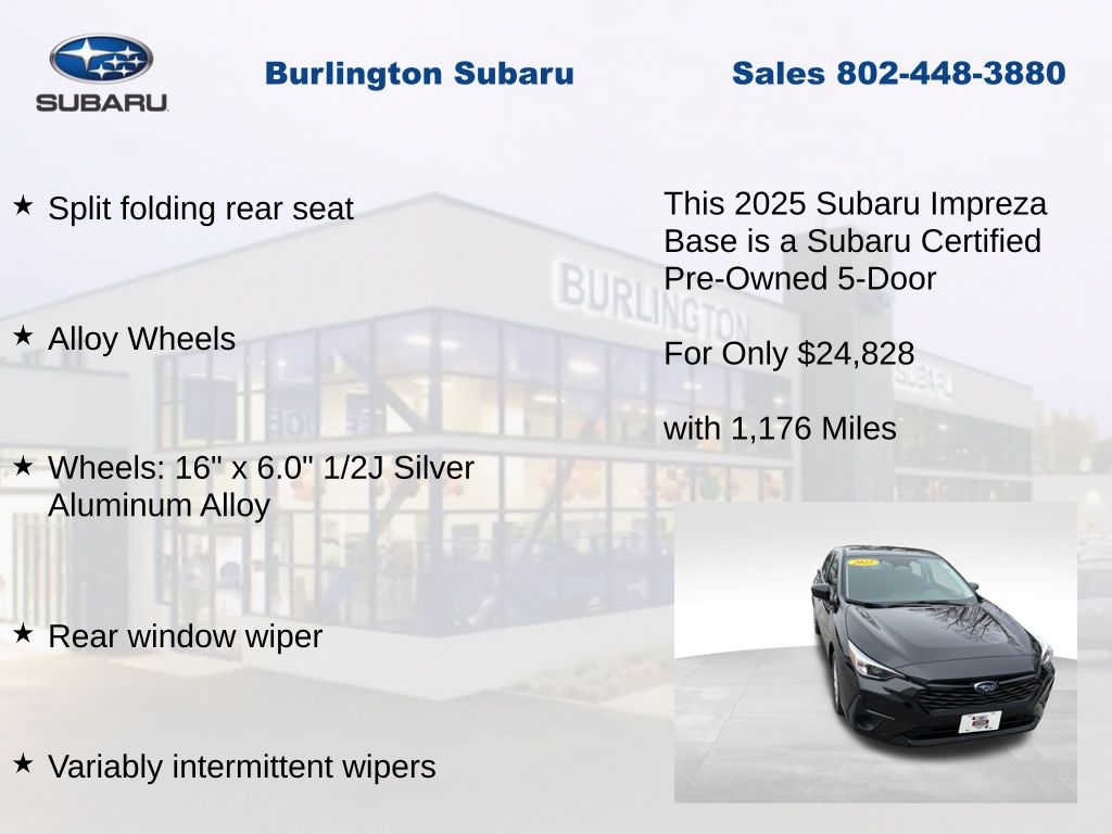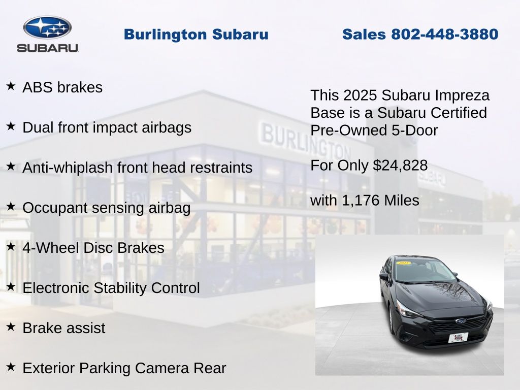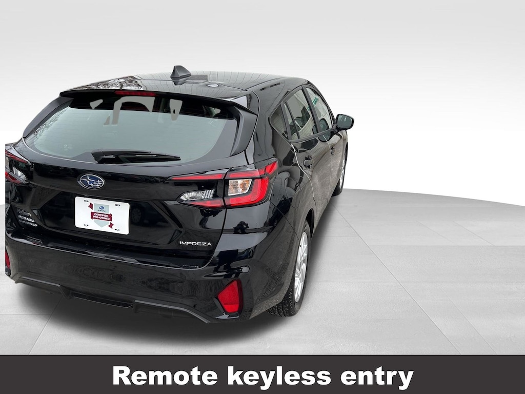 Clean CARFAX. Subaru Impreza 2025 Certified. 4-Wheel Disc Brakes, ABS brakes, Air Conditioning, Alloy Wheels, Anti-whiplash front head restraints, Auto High-beam Headlights, Automatic temperature control, Brake assist, Driver vanity mirror, Dual front impact airbags, Dual front side impact airbags, Electronic Stability Control, Exterior Parking Camera Rear, Footwell Illumination Kit (DIO), Four wheel independent suspension, Front Bucket Seats, Front dual zone A/C, Front reading lights, Fully automatic headlights, Illuminated entry, Knee airbag, Low tire pressure warning, Occupant sensing airbag, Outside temperature display, Overhead airbag, Panic alarm, Passenger vanity mirror, Power door mirrors, Power steering, Power windows, Radio: Subaru Dual 7" Multimedia System, Rear window defroster, Rear window wiper, Remote keyless entry, Speed control, Speed-sensing steering, Split folding rear seat, Steering wheel mounted audio controls, Tachometer, Telescoping steering wheel, Tilt steering wheel, Traction control, Trip computer, Variably intermittent wipers, Wheels: 16" x 6.0" 1/2J Silver Aluminum Alloy. Odometer is 2390 miles below market average!