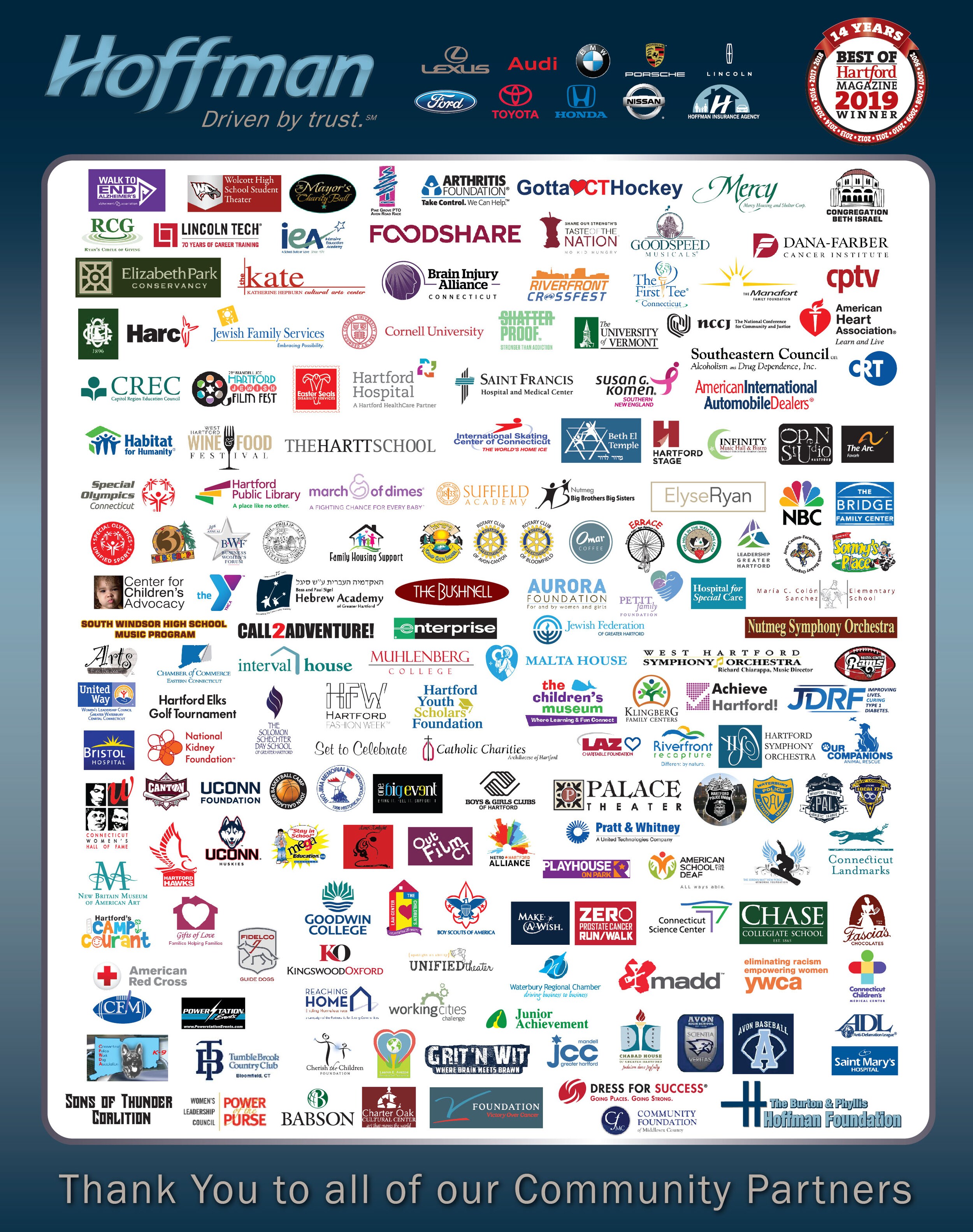 Our motto here is, Driven by trust. and you'll see that come through in everything we do. On this page, we're just taking a moment to say a big "Thank You!" to some of our partners throughout the community. We believe in supporting strong communities-after all, there are no strong businesses without strong communities! We're proud to be your local BMW dealership and we're committed to continuing the long tradition of community involvement at Hoffman dealerships!
