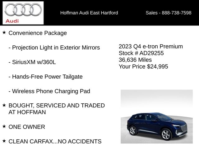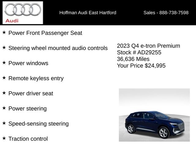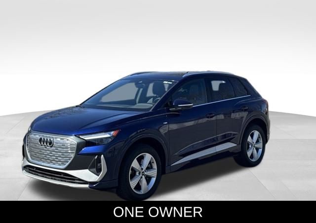 BOUGHT, SERVICED AND TRADED AT HOFFMAN, ONE OWNER, CLEAN CARFAX...NO ACCIDENTS, RECENT HOFFMAN TRADE, INCLUDES WARRANTY, PREMIUM PKG, HOFFMAN NEW CAR TRADE, NAVIGATION, 6 MONTHS/6000 MILES POWERTRAIN WARRANTY, 8 Speakers, ABS brakes, Air Conditioning, Alarm System w/Motion Sensor, Alloy wheels, Audi Advanced Key, Auto High-beam Headlights, Auto-Dimming Interior Mirror w/Compass, Auto-Dimming Power Folding Exterior Mirrors, Automatic temperature control, Brake assist, Bumpers: body-color, Convenience Package, Delay-off headlights, Driver door bin, Driver vanity mirror, Dual front impact airbags, Dual-Pane Acoustic Glass for Front Side Windows, Electronic Stability Control, Emergency communication system: Audi connect CARE, Exterior Parking Camera Rear, Four wheel independent suspension, Front anti-roll bar, Front Bucket Seats, Front Center Armrest, Front dual zone A/C, Front reading lights, Fully automatic headlights, Genuine wood dashboard insert, Hands-Free Power Tailgate, Heated door mirrors, Heated Front Seats, Heated front seats, Illuminated entry, Leather Seating Surfaces, Leather steering wheel, Low tire pressure warning, Memory for Driver's Seat, Navigation System, Occupant sensing airbag, Outside temperature display, Overhead airbag, Overhead console, Panic alarm, Passenger door bin, Passenger vanity mirror, Power door mirrors, Power driver seat, Power Front Passenger Seat, Power Liftgate, Power moonroof: Panoramic, Power steering, Power windows, Projection Light in Exterior Mirrors, Radio data system, Radio: Audi Sound System, Rain sensing wipers, Rear air conditioning, Rear anti-roll bar, Rear reading lights, Rear seat center armrest, Rear window defroster, Rear window wiper, Remote keyless entry, Security system, SiriusXM w/360L, Speed control, Speed-sensing steering, Split folding rear seat, Spoiler, Steering wheel mounted audio controls, TBD Axle Ratio, Telescoping steering wheel, Tilt steering wheel, Traction control, Trip computer, Turn signal indicator mirrors, Variably intermittent wipers, Wheels: 19" 5-Arm Design, Wireless Phone Charging Pad. CARFAX One-Owner. Clean CARFAX. Navarra Blue Metallic 2023 Audi Q4 e-tron Premium quattro quattro Single-Speed Automatic Electric Motor