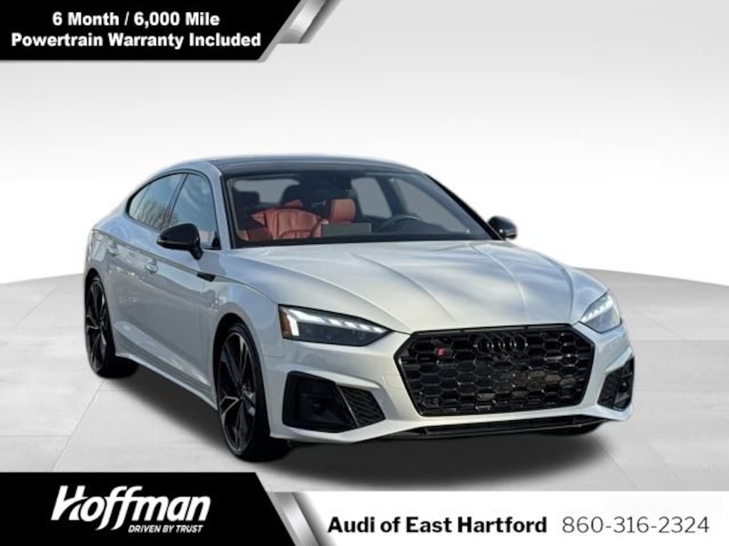 PREMIUM PLUS PKG, 6 MONTHS/6000 MILES POWERTRAIN WARRANTY, 10 Speakers, 4-Wheel Disc Brakes, ABS brakes, Air Conditioning, Alloy wheels, AM/FM radio, Auto High-beam Headlights, Auto-dimming Rear-View mirror, Automatic temperature control, Brake assist, Bumpers: body-color, Compass, Delay-off headlights, Driver door bin, Driver vanity mirror, Dual front impact airbags, Dual front side impact airbags, Electronic Stability Control, Emergency communication system: Audi connect CARE, Exterior Parking Camera Rear, Four wheel independent suspension, Front anti-roll bar, Front Bucket Seats, Front Center Armrest, Front dual zone A/C, Front fog lights, Front reading lights, Garage door transmitter: HomeLink, Heated door mirrors, Heated Front S Sport Seats, Heated front seats, Illuminated entry, Knee airbag, Leather Shift Knob, Leather steering wheel, Leather/Dinamica Seating Surfaces, Low tire pressure warning, Occupant sensing airbag, Outside temperature display, Overhead airbag, Overhead console, Panic alarm, Passenger door bin, Passenger vanity mirror, Power door mirrors, Power driver seat, Power Liftgate, Power moonroof, Power passenger seat, Power steering, Power windows, Radio data system, Radio: Audi Sound System, Rear air conditioning, Rear anti-roll bar, Rear reading lights, Rear seat center armrest, Rear window defroster, Remote keyless entry, Speed control, Speed-sensing steering, Split folding rear seat, Spoiler, Steering wheel mounted audio controls, Tachometer, Telescoping steering wheel, Tilt steering wheel, Traction control, Trip computer, Turn signal indicator mirrors. CARFAX One-Owner. White 2023 Audi S5 Sportback Premium Plus quattro quattro 8-Speed Automatic with Tiptronic 3.0L TFSI