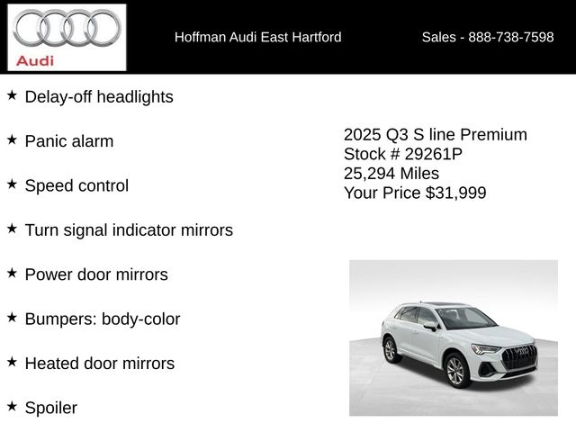 ONE OWNER, CLEAN CARFAX...NO ACCIDENTS, REMAINDER OF FACTORY WARRANTY, 6 MONTHS/6000 MILES POWERTRAIN WARRANTY, 10 Speakers, 4-Wheel Disc Brakes, ABS brakes, Air Conditioning, Alloy wheels, AM/FM radio, Audi MMI Navigation Plus, Audi smartphone interface (Apple CarPlay/Android Auto), Auto High-beam Headlights, Automatic temperature control, Brake assist, Bumpers: body-color, Delay-off headlights, Driver door bin, Driver vanity mirror, Dual front impact airbags, Dual front side impact airbags, Electronic Stability Control, Emergency communication system: Audi connect CARE, Exterior Parking Camera Rear, Four wheel independent suspension, Front anti-roll bar, Front Bucket Seats, Front Center Armrest, Front dual zone A/C, Front fog lights, Front reading lights, Fully automatic headlights, Heated door mirrors, Heated Front Bucket Seats, Heated front seats, Illuminated entry, Knee airbag, Leather Seating Surfaces, Leather Shift Knob, Leather steering wheel, Low tire pressure warning, Occupant sensing airbag, Outside temperature display, Overhead airbag, Overhead console, Panic alarm, Passenger door bin, Passenger vanity mirror, Power door mirrors, Power driver seat, Power Liftgate, Power moonroof: Panoramic, Power passenger seat, Power steering, Power windows, Radio data system, Radio: Audi Sound System, Rain sensing wipers, Rear air conditioning, Rear anti-roll bar, Rear reading lights, Rear seat center armrest, Rear window defroster, Rear window wiper, Remote keyless entry, Speed control, Speed-sensing steering, Split folding rear seat, Spoiler, Steering wheel mounted audio controls, Tachometer, Telescoping steering wheel, Tilt steering wheel, Traction control, Trip computer, Turn signal indicator mirrors, Variably intermittent wipers, Wheels: 18" 5-V-Spoke-S Design. CARFAX One-Owner. Clean CARFAX. Glacier White Metallic 2025 Audi Q3 Premium S Line quattro quattro 8-Speed Automatic with Tiptronic 2.0L 4-Cylinder TFSI