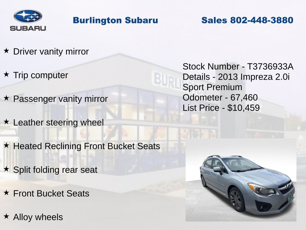 Subaru Impreza 2.0i Sport Premium 2013 4-Wheel Disc Brakes, ABS brakes, Air Conditioning, Alloy wheels, AM/FM Stereo w/Single-Disc CD Player, Brake assist, Driver vanity mirror, Dual front impact airbags, Dual front side impact airbags, Electronic Stability Control, Four wheel independent suspension, Front Bucket Seats, Front fog lights, Front reading lights, Heated door mirrors, Heated Reclining Front Bucket Seats, Illuminated entry, Knee airbag, Leather Shift Knob, Leather steering wheel, Low tire pressure warning, Occupant sensing airbag, Outside temperature display, Overhead airbag, Panic alarm, Passenger vanity mirror, Power door mirrors, Power steering, Power windows, Rear window defroster, Rear window wiper, Remote keyless entry, Speed control, Speed-sensing steering, Split folding rear seat, Steering wheel mounted audio controls, Tachometer, Telescoping steering wheel, Tilt steering wheel, Traction control, Trip computer, Variably intermittent wipers. Odometer is 39633 miles below market average!