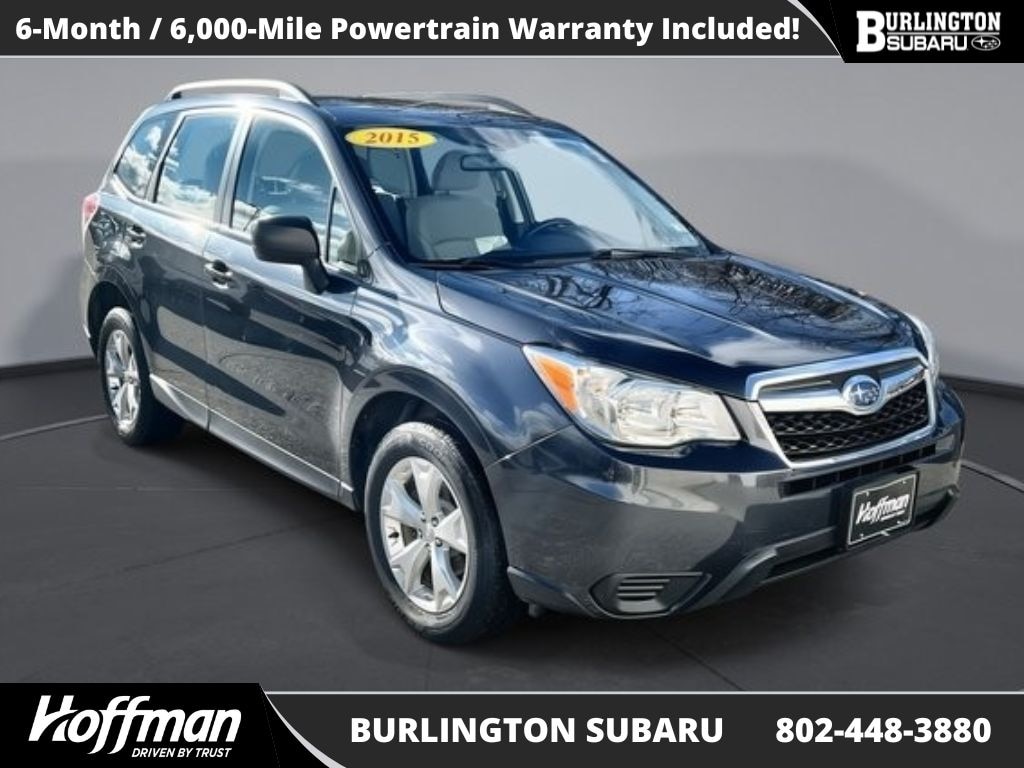 CARFAX One-Owner. Clean CARFAX. Subaru Forester 2.5i 2015 17" Alloy Wheels, 4-Wheel Disc Brakes, ABS brakes, Air Conditioning, Alloy Wheel Package, AM/FM Stereo w/Single Disc CD Player, Black Finish Roof Rails, Brake assist, Driver door bin, Driver vanity mirror, Dual front impact airbags, Dual front side impact airbags, Electronic Stability Control, Exterior Parking Camera Rear, Four wheel independent suspension, Front Center Armrest, Front reading lights, Illuminated entry, Knee airbag, Low tire pressure warning, Occupant sensing airbag, Outside temperature display, Overhead airbag, Overhead console, Panic alarm, Passenger vanity mirror, Power door mirrors, Power steering, Power windows, Rear window defroster, Rear window wiper, Remote keyless entry, Speed control, Split folding rear seat, Steering wheel mounted audio controls, Tachometer, Telescoping steering wheel, Tilt steering wheel, Traction control, Trip computer, Variably intermittent wipers. Odometer is 48003 miles below market average!