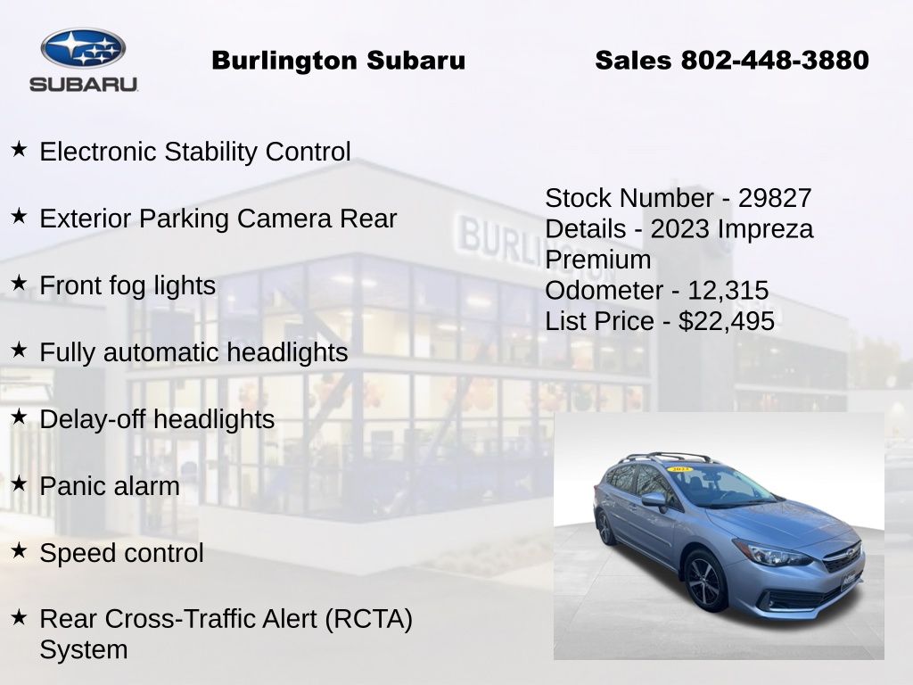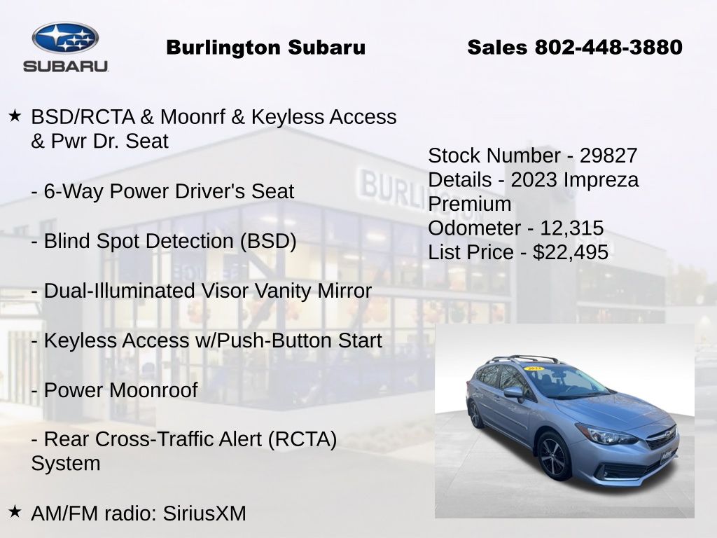 CARFAX One-Owner. Clean CARFAX. Subaru Impreza Premium 2023 4-Wheel Disc Brakes, 6-Way Power Driver's Seat, ABS brakes, Air Conditioning, Alloy wheels, AM/FM radio: SiriusXM, Anti-whiplash front head restraints, Blind Spot Detection (BSD), Brake assist, BSD/RCTA & Moonrf & Keyless Access & Pwr Dr. Seat, CD player, Delay-off headlights, Driver vanity mirror, Dual front impact airbags, Dual front side impact airbags, Dual-Illuminated Visor Vanity Mirror, Electronic Stability Control, Emergency communication system, Exterior Parking Camera Rear, Four wheel independent suspension, Front fog lights, Front reading lights, Fully automatic headlights, Heated Front Bucket Seats, Illuminated entry, Keyless Access w/Push-Button Start, Knee airbag, Low tire pressure warning, Occupant sensing airbag, Outside temperature display, Overhead airbag, Panic alarm, Passenger vanity mirror, Power door mirrors, Power Moonroof, Power steering, Power windows, Rear Cross-Traffic Alert (RCTA) System, Rear window defroster, Rear window wiper, Remote keyless entry, Speed control, Speed-sensing steering, Split folding rear seat, STARLINK/Apple CarPlay/Android Auto, Steering wheel mounted audio controls, Tachometer, Telescoping steering wheel, Tilt steering wheel, Traction control, Trip computer, Variably intermittent wipers. Odometer is 10709 miles below market average!