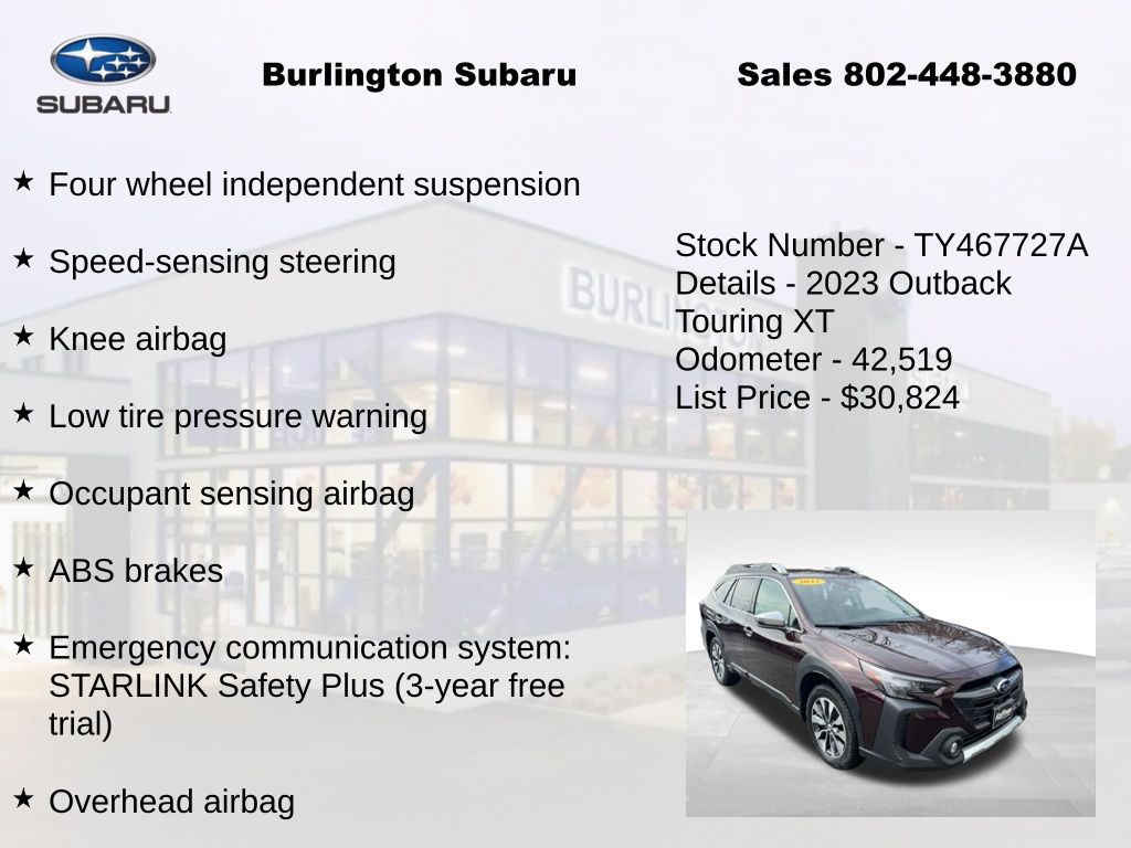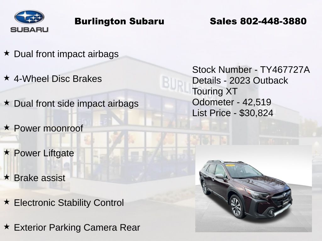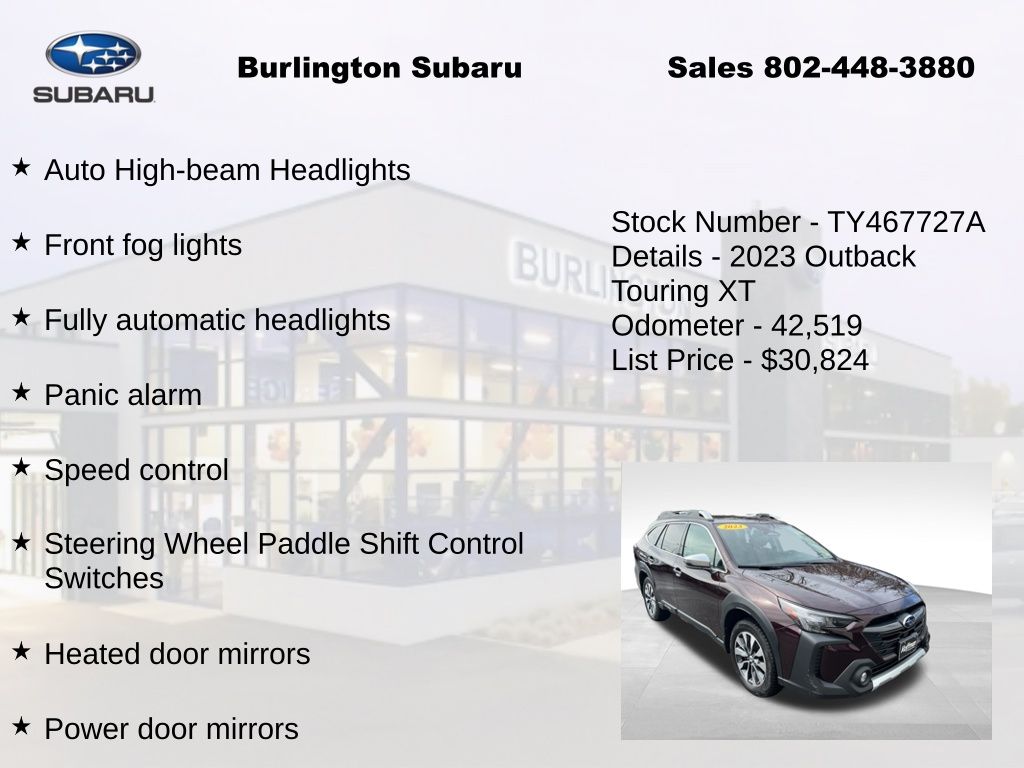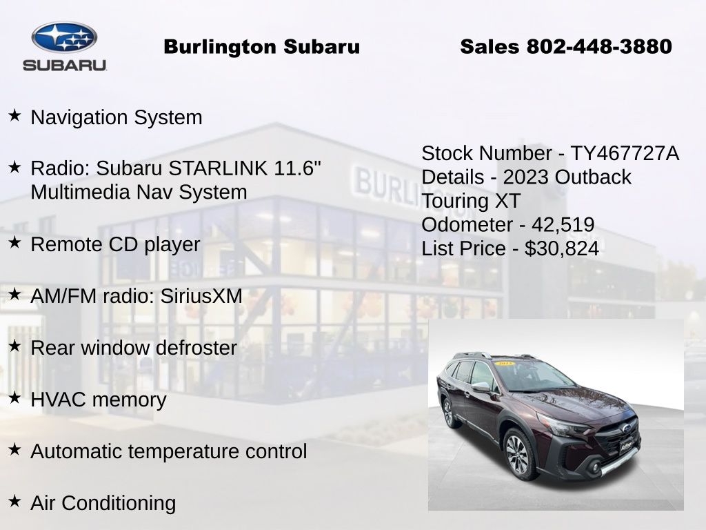 CARFAX One-Owner. Clean CARFAX. Subaru Outback Touring XT 2023 4-Wheel Disc Brakes, ABS brakes, Air Conditioning, Alloy wheels, AM/FM radio: SiriusXM, Auto High-beam Headlights, Auto-dimming Rear-View mirror, Automatic temperature control, Brake assist, Compass, Driver vanity mirror, Dual front impact airbags, Dual front side impact airbags, Electronic Stability Control, Emergency communication system: STARLINK Safety Plus (3-year free trial), Exterior Parking Camera Rear, Four wheel independent suspension, Front dual zone A/C, Front fog lights, Front reading lights, Fully automatic headlights, Garage door transmitter: HomeLink, Heated & Ventilated Front Bucket Seats, Heated door mirrors, Heated steering wheel, HVAC memory, Illuminated entry, Knee airbag, Leather Shift Knob, Leather steering wheel, Low tire pressure warning, Memory seat, Navigation System, Occupant sensing airbag, Outside temperature display, Overhead airbag, Panic alarm, Passenger vanity mirror, Perforated Nappa Leather-Trimmed Upholstery, Power door mirrors, Power driver seat, Power Liftgate, Power moonroof, Power passenger seat, Power steering, Power windows, Radio: Subaru STARLINK 11.6" Multimedia Nav System, Rear window defroster, Rear window wiper, Remote CD player, Remote keyless entry, Speed control, Speed-sensing steering, Split folding rear seat, Steering wheel mounted audio controls, Steering Wheel Paddle Shift Control Switches, Tachometer, Telescoping steering wheel, Tilt steering wheel, Traction control, Trip computer, Turn signal indicator mirrors, Variably intermittent wipers, Ventilated front seats.