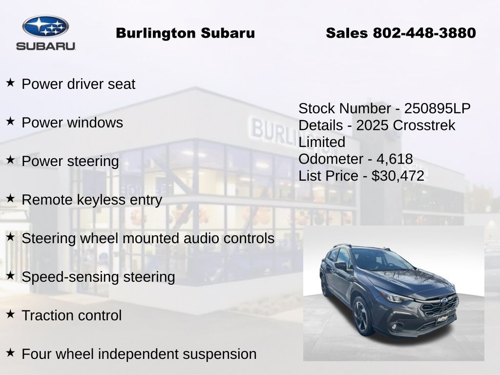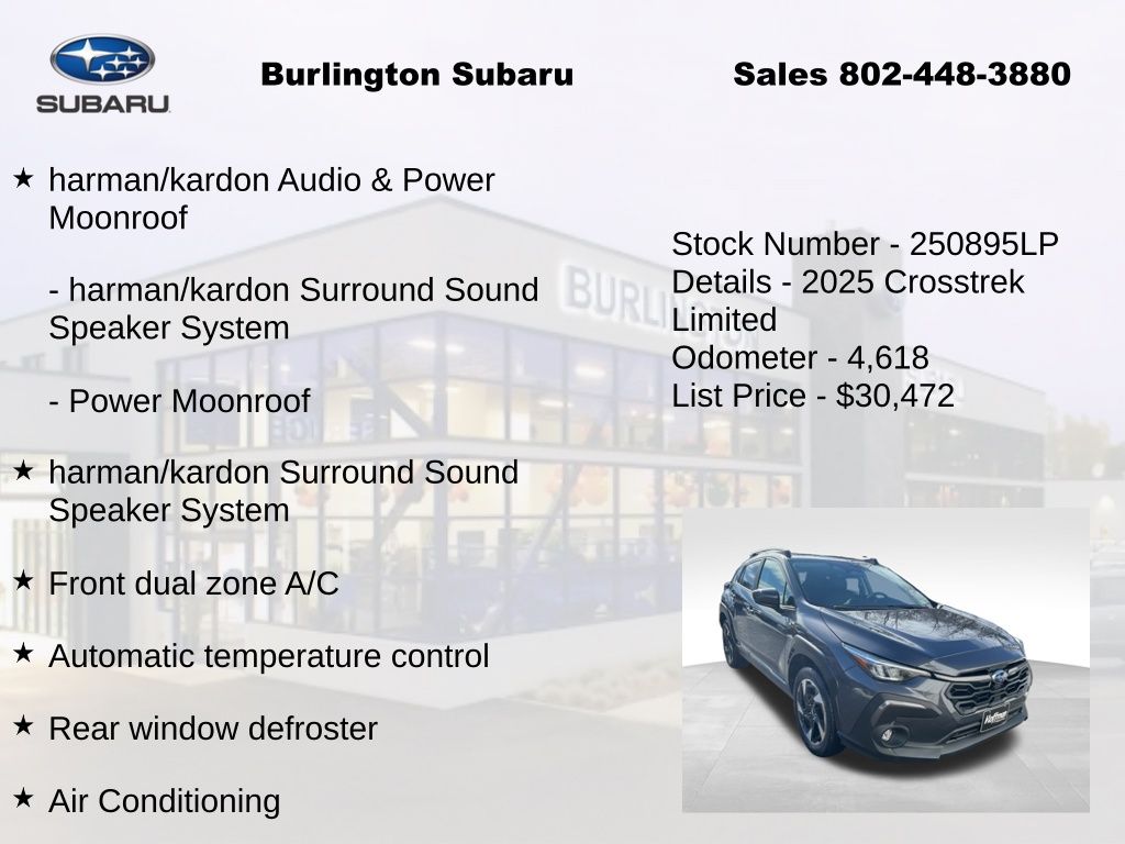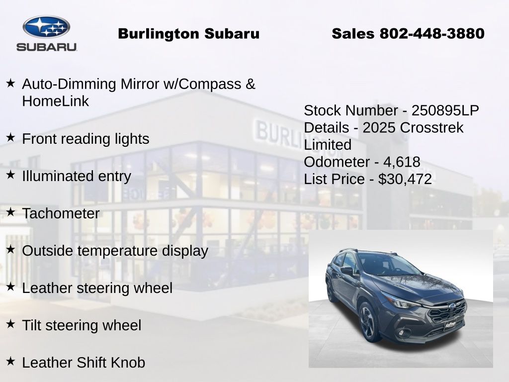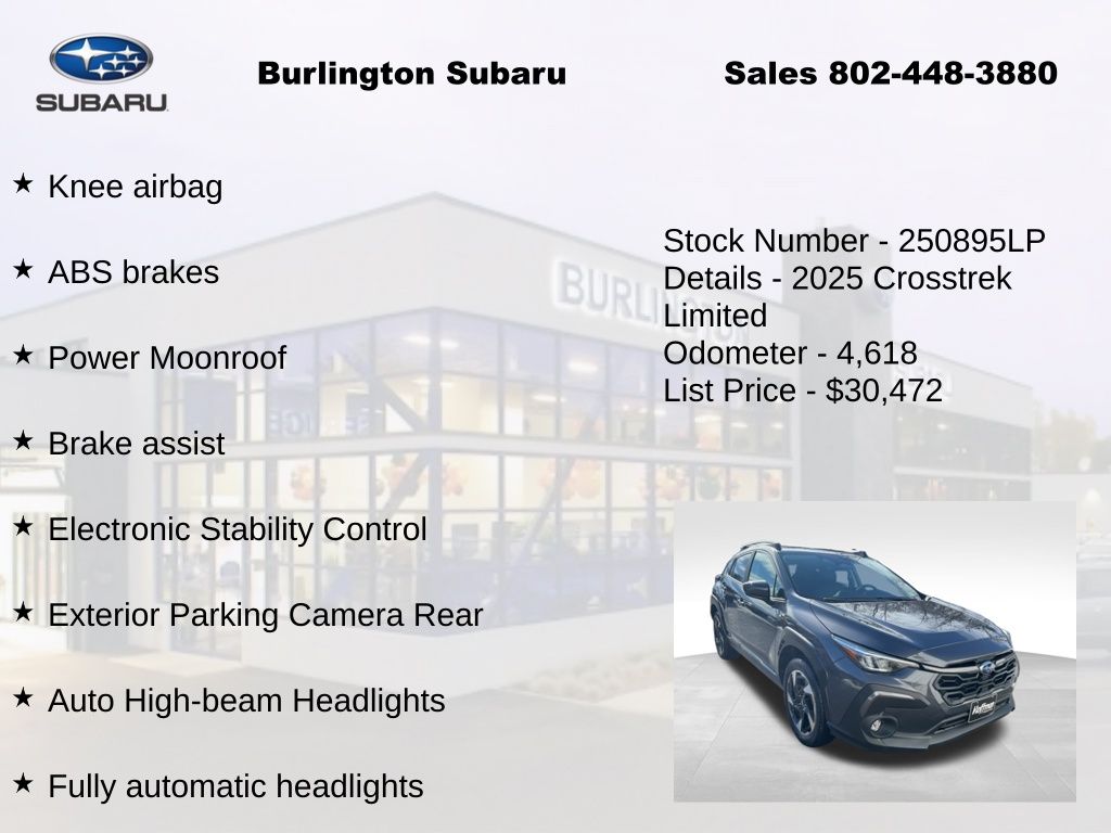 CARFAX One-Owner. Clean CARFAX. Subaru Crosstrek Limited 2025 4-Wheel Disc Brakes, ABS brakes, Air Conditioning, Alloy wheels, Anti-whiplash front head restraints, Auto High-beam Headlights, Auto-Dimming Exterior Mirror w/Approach Light, Auto-Dimming Mirror w/Compass & HomeLink, Automatic temperature control, Brake assist, Driver vanity mirror, Dual front impact airbags, Dual front side impact airbags, Electronic Stability Control, Emergency communication system, Exterior Parking Camera Rear, Four wheel independent suspension, Front dual zone A/C, Front fog lights, Front reading lights, Fully automatic headlights, harman/kardon Audio & Power Moonroof, harman/kardon Surround Sound Speaker System, Heated door mirrors, Heated Front Bucket Seats, Illuminated entry, Knee airbag, Leather Shift Knob, Leather steering wheel, Leather-Trimmed Upholstery, LED Upgrade, Low tire pressure warning, Occupant sensing airbag, Outside temperature display, Overhead airbag, Panic alarm, Passenger vanity mirror, Power door mirrors, Power driver seat, Power Moonroof, Power steering, Power windows, Rear window defroster, Rear window wiper, Remote keyless entry, Speed control, Speed-sensing steering, Split folding rear seat, Steering wheel mounted audio controls, Tachometer, Telescoping steering wheel, Tilt steering wheel, Traction control, Trip computer, Turn signal indicator mirrors, Variably intermittent wipers.
