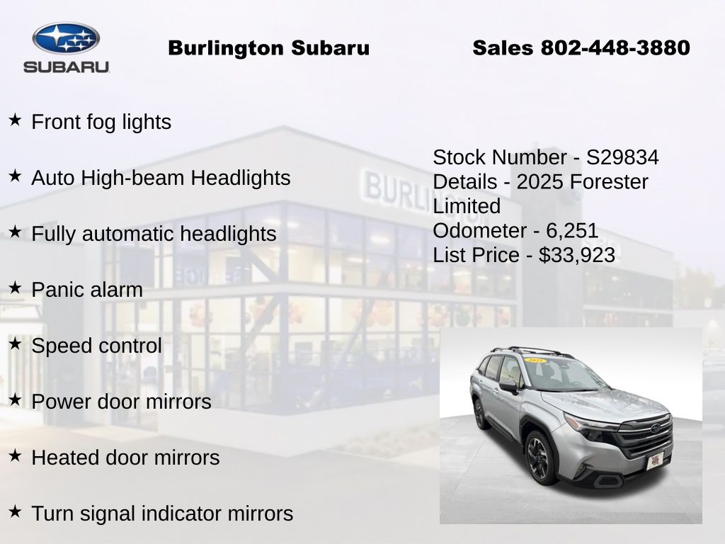 CARFAX One-Owner. Clean CARFAX. Subaru Forester Limited 2025 4-Wheel Disc Brakes, ABS brakes, Air Conditioning, Alloy wheels, Anti-whiplash front head restraints, Auto High-beam Headlights, Automatic temperature control, Brake assist, Driver vanity mirror, Dual front impact airbags, Dual front side impact airbags, Electronic Stability Control, Emergency communication system: MySubaru Safety (3-year free trial), Exterior Parking Camera Rear, Four wheel independent suspension, Front dual zone A/C, Front fog lights, Front reading lights, Fully automatic headlights, harman/kardon Audio & Navigation & RAB, Heated door mirrors, Heated Front Bucket Seats, Heated steering wheel, Illuminated entry, Knee airbag, Leather steering wheel, Low tire pressure warning, Occupant sensing airbag, Outside temperature display, Overhead airbag, Overhead console, Panic alarm, Passenger vanity mirror, Perforated Leather-Trimmed Upholstery, Power door mirrors, Power driver seat, Power Liftgate, Power moonroof: Panoramic, Power passenger seat, Power steering, Power windows, Radio: Subaru 11.6" Multimedia Navigation System, Rear window defroster, Rear window wiper, Remote keyless entry, Reverse Automatic Braking (RAB) System, Speed control, Speed-sensing steering, Split folding rear seat, Steering wheel mounted audio controls, Tachometer, Telescoping steering wheel, Tilt steering wheel, Traction control, Trip computer, Turn signal indicator mirrors, Variably intermittent wipers. Odometer is 4625 miles below market average!