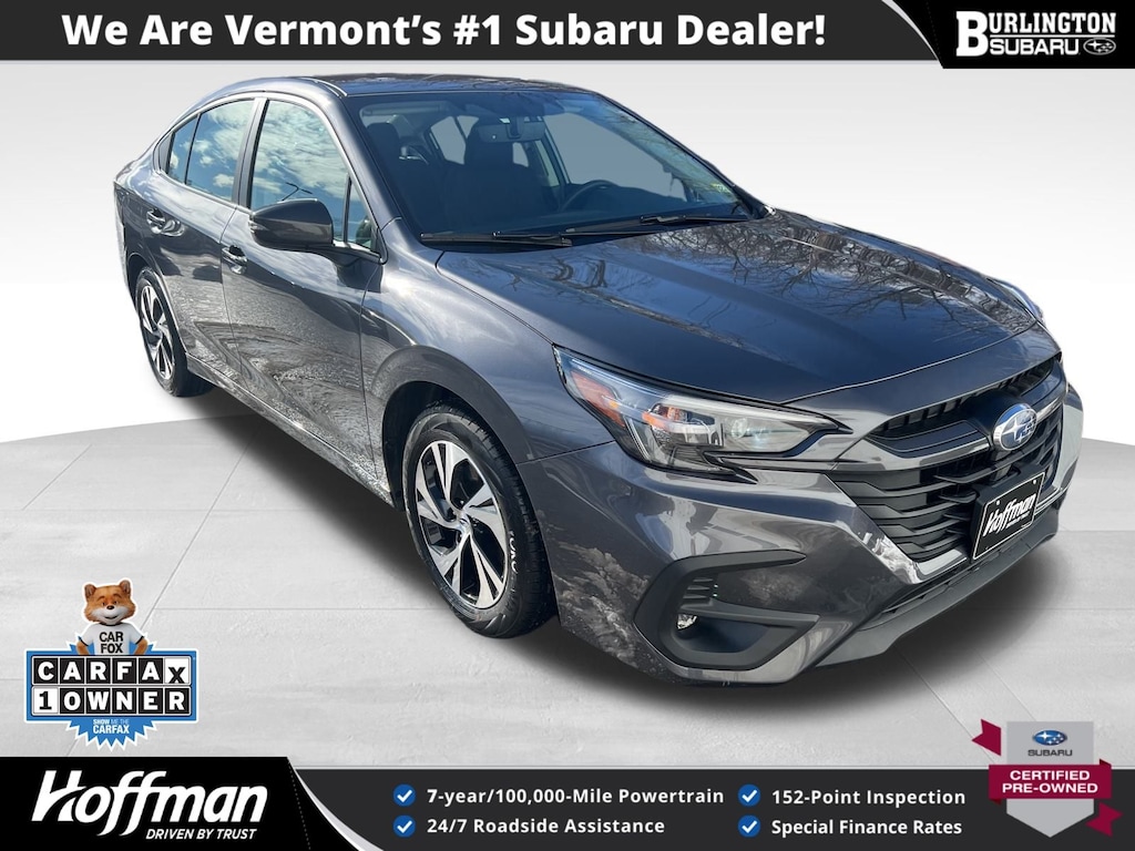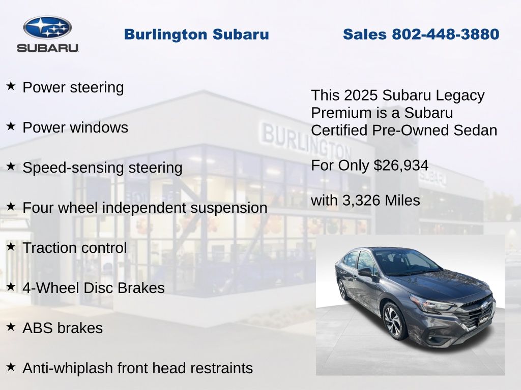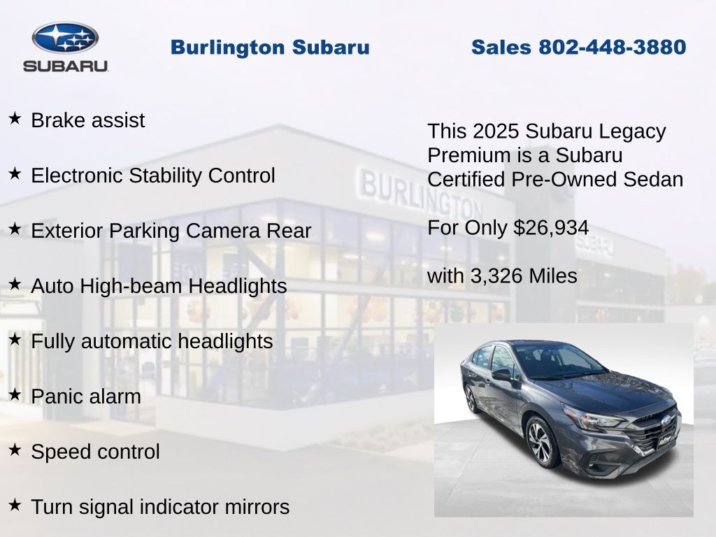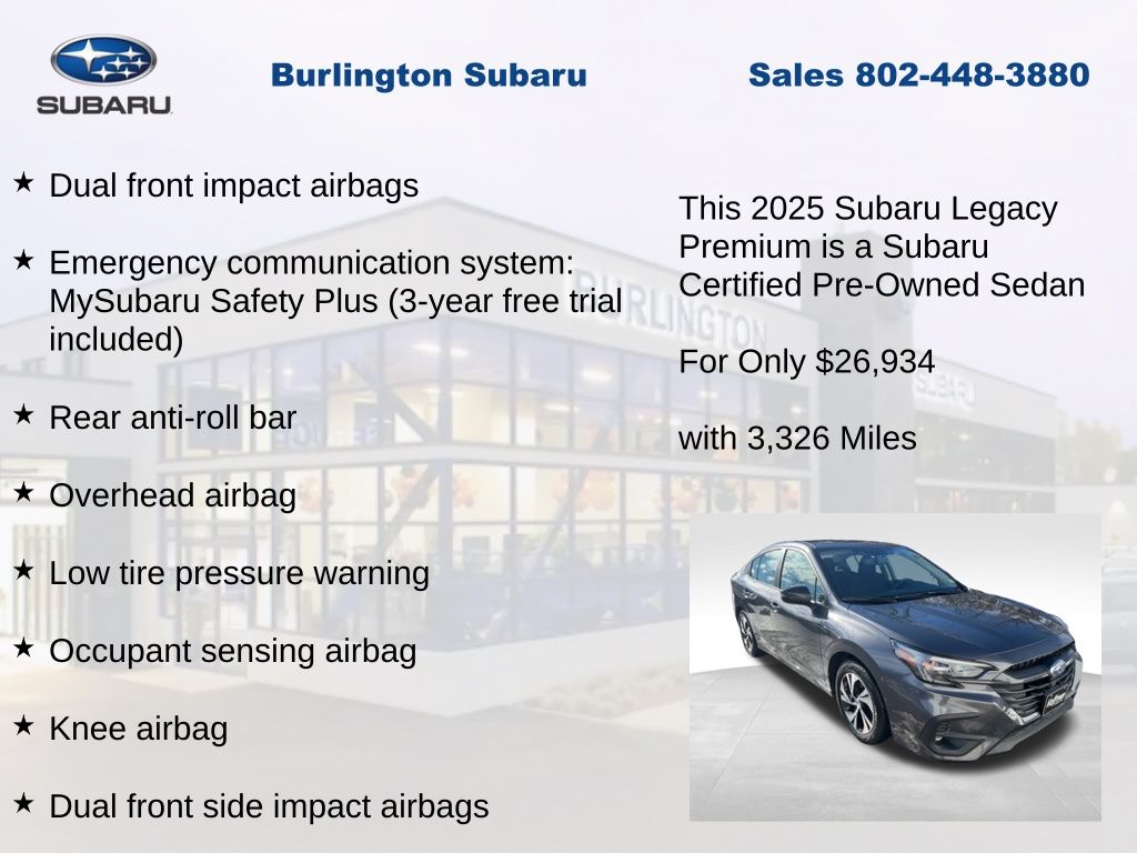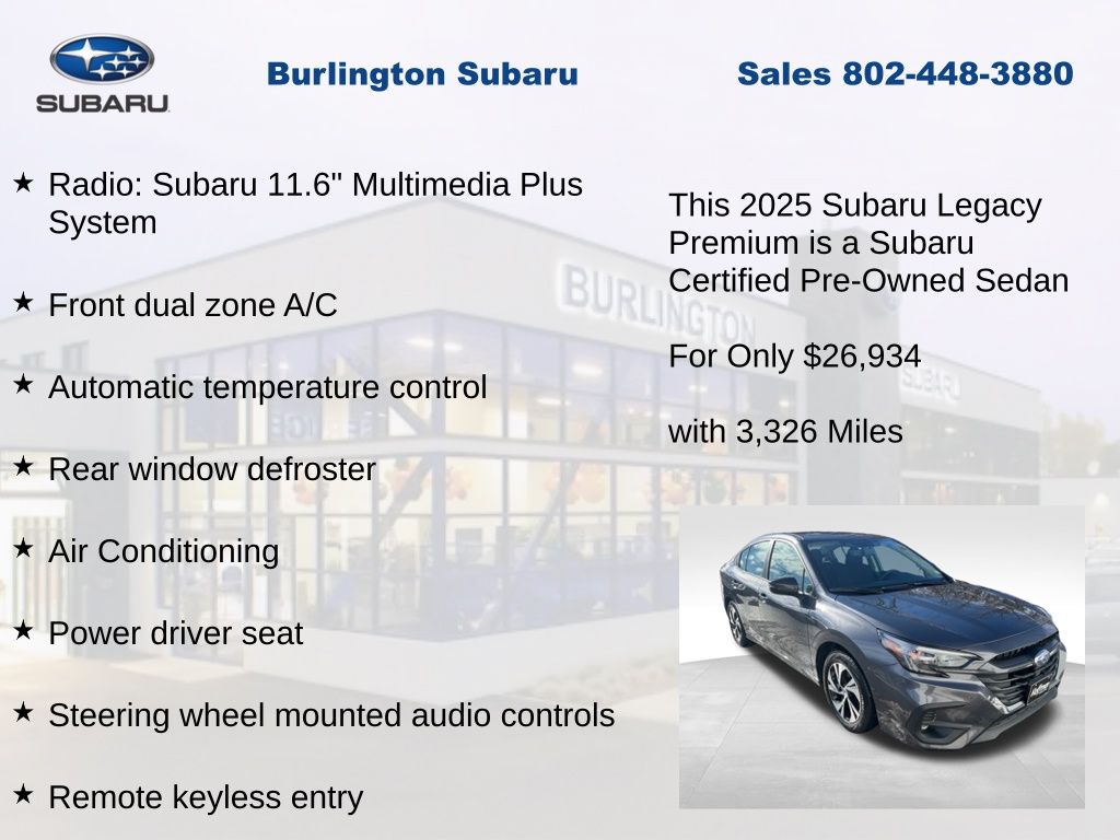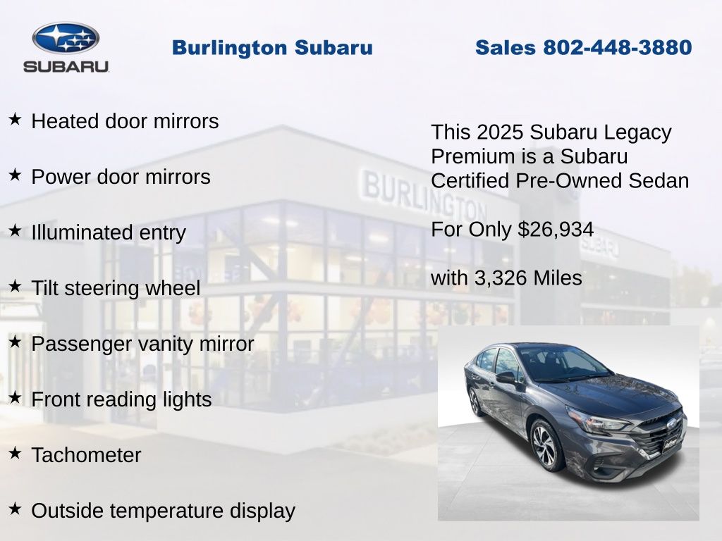 CARFAX One-Owner. Clean CARFAX. Subaru Legacy Premium 2025 Certified. 4-Wheel Disc Brakes, ABS brakes, Air Conditioning, Alloy wheels, Anti-whiplash front head restraints, Apple CarPlay & Android Auto, Auto High-beam Headlights, Automatic temperature control, Brake assist, Driver vanity mirror, Dual front impact airbags, Dual front side impact airbags, Electronic Stability Control, Emergency communication system: MySubaru Safety Plus (3-year free trial included), Exterior Parking Camera Rear, Four wheel independent suspension, Front dual zone A/C, Front reading lights, Fully automatic headlights, Heated door mirrors, Heated Front Bucket Seats, Illuminated entry, Knee airbag, Leather steering wheel, Low tire pressure warning, Occupant sensing airbag, Outside temperature display, Overhead airbag, Panic alarm, Passenger vanity mirror, Power door mirrors, Power driver seat, Power steering, Power windows, Radio: Subaru 11.6" Multimedia Plus System, Rear anti-roll bar, Rear window defroster, Remote keyless entry, Speed control, Speed-sensing steering, Split folding rear seat, Steering wheel mounted audio controls, Tachometer, Telescoping steering wheel, Tilt steering wheel, Traction control, Trip computer, Turn signal indicator mirrors, Variably intermittent wipers, Wheels: 17" x 7.5J Blk Mach Finish Aluminum-Alloy. Odometer is 659 miles below market average!