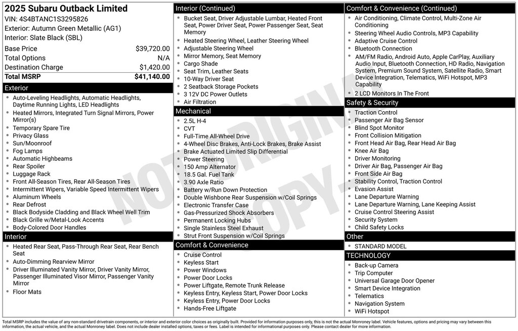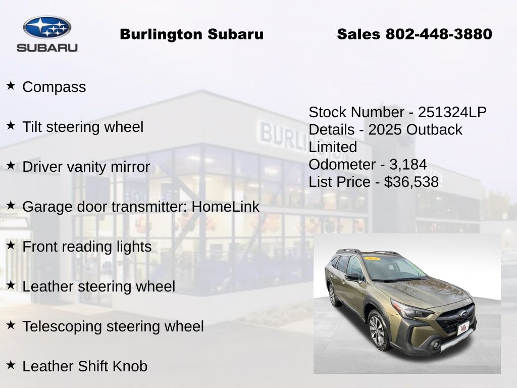 Clean CARFAX. Subaru Outback Limited 2025 4-Wheel Disc Brakes, ABS brakes, Air Conditioning, Alloy wheels, AM/FM radio: SiriusXM with 360L, Apple CarPlay & Android Auto, Auto High-beam Headlights, Auto-dimming Rear-View mirror, Automatic temperature control, Brake assist, Compass, Driver vanity mirror, Dual front impact airbags, Dual front side impact airbags, Electronic Stability Control, Emergency communication system: MySubaru Safety (3-year free trial), Exterior Parking Camera Rear, Four wheel independent suspension, Front dual zone A/C, Front fog lights, Front reading lights, Fully automatic headlights, Garage door transmitter: HomeLink, harman/kardon® Speakers, Heated door mirrors, Heated Front Bucket Seats, Heated steering wheel, HVAC memory, Illuminated entry, Knee airbag, Leather Shift Knob, Leather steering wheel, Low tire pressure warning, Memory seat, Navigation system: TomTom Navigation w/what3words, Occupant sensing airbag, Outside temperature display, Overhead airbag, Passenger vanity mirror, Perforated Leather-Trimmed Upholstery, Power door mirrors, Power driver seat, Power Liftgate, Power moonroof, Power passenger seat, Power steering, Power windows, Radio: Subaru 11.6" Multimedia System w/Navigation, Rear window defroster, Rear window wiper, Remote keyless entry, Speed control, Speed-sensing steering, Split folding rear seat, Steering wheel mounted audio controls, Tachometer, Telescoping steering wheel, Tilt steering wheel, Traction control, Trip computer, Turn signal indicator mirrors, Variably intermittent wipers. Odometer is 5016 miles below market average!