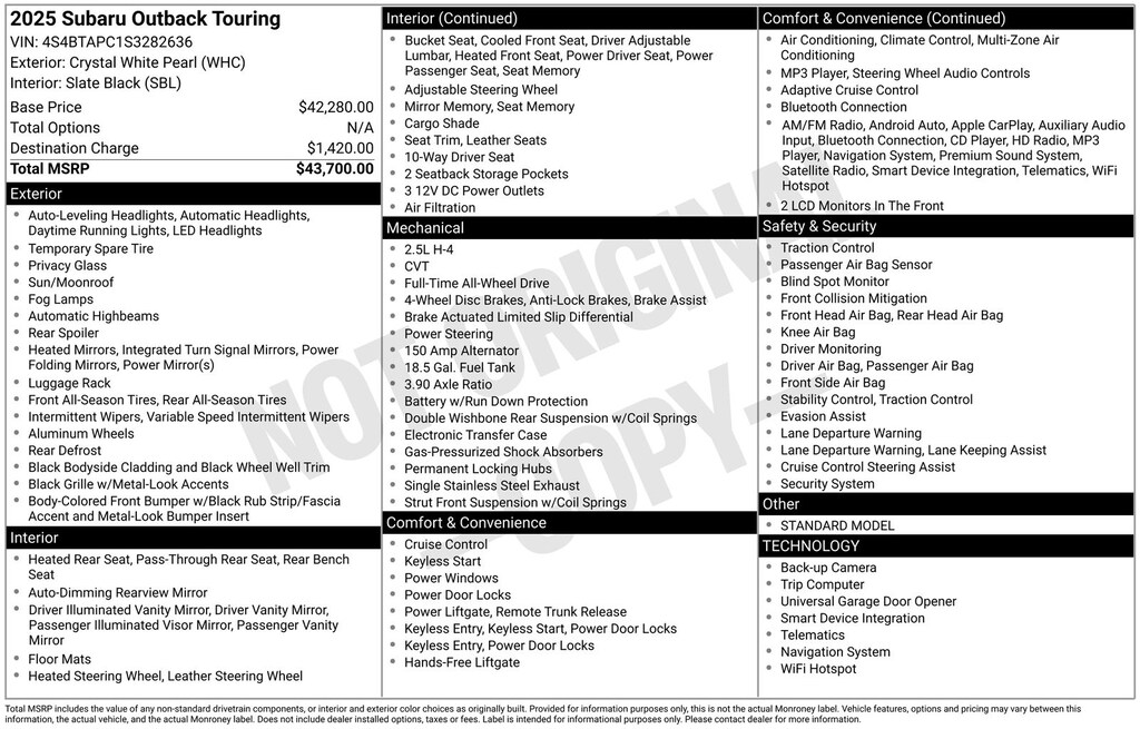 Clean CARFAX. Subaru Outback Touring 2025 Certified. 4-Wheel Disc Brakes, ABS brakes, Air Conditioning, Alloy wheels, Apple CarPlay & Android Auto, Auto High-beam Headlights, Auto-dimming Rear-View mirror, Automatic temperature control, Brake assist, Compass, Driver vanity mirror, Dual front impact airbags, Dual front side impact airbags, Electronic Stability Control, Emergency communication system: MySubaru Safety (3-year free trial), Exterior Parking Camera Rear, Four wheel independent suspension, Front dual zone A/C, Front fog lights, Front reading lights, Fully automatic headlights, Garage door transmitter: HomeLink, harman/kardon® Speakers, Heated & Ventilated Front Bucket Seats, Heated door mirrors, Heated steering wheel, HVAC memory, Illuminated entry, Knee airbag, Leather Shift Knob, Leather steering wheel, Low tire pressure warning, Memory seat, Navigation system: TomTom Navigation w/what3words, Occupant sensing airbag, Outside temperature display, Overhead airbag, Panic alarm, Passenger vanity mirror, Perforated Nappa Leather-Trimmed Upholstery, Power door mirrors, Power driver seat, Power Liftgate, Power moonroof, Power passenger seat, Power steering, Power windows, Radio: Subaru 11.6" Multimedia System w/Navigation, Rear window defroster, Rear window wiper, Remote CD player, Remote keyless entry, Speed control, Speed-sensing steering, Split folding rear seat, Steering wheel mounted audio controls, Tachometer, Telescoping steering wheel, Tilt steering wheel, Traction control, Trip computer, Turn signal indicator mirrors, Variably intermittent wipers, Ventilated front seats. Odometer is 6137 miles below market average!