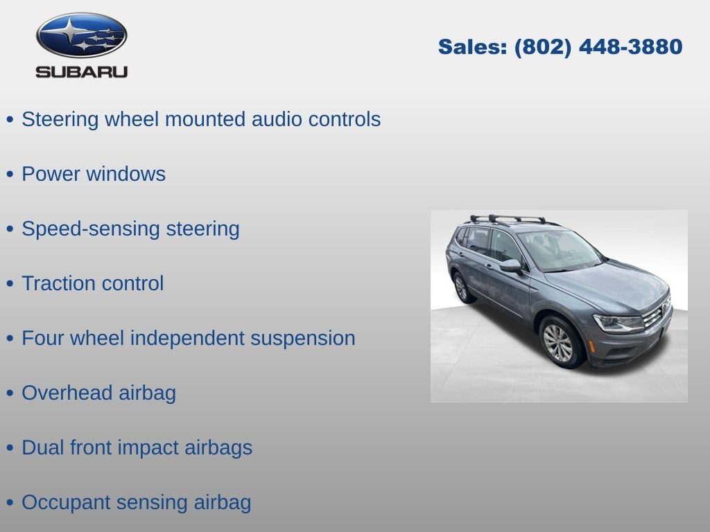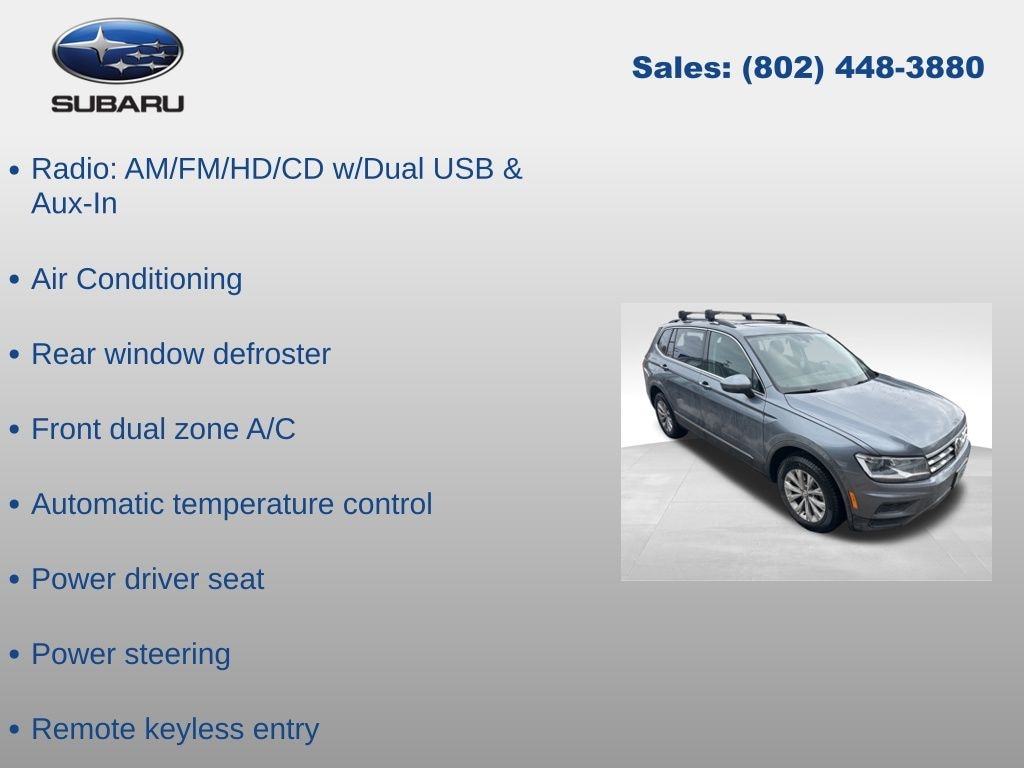 Volkswagen Tiguan 2.0T SE 2018 4-Wheel Disc Brakes, ABS brakes, Air Conditioning, Alloy wheels, Automatic temperature control, Brake assist, Compass, Delay-off headlights, Driver vanity mirror, Dual front impact airbags, Dual front side impact airbags, Electronic Stability Control, Emergency communication system: VW Car-Net, Exterior Parking Camera Rear, Four wheel independent suspension, Front dual zone A/C, Front reading lights, Fully automatic headlights, Heated door mirrors, Heated Front Bucket Seats, Illuminated entry, Leather Shift Knob, Low tire pressure warning, Occupant sensing airbag, Outside temperature display, Overhead airbag, Panic alarm, Passenger vanity mirror, Perforated V-Tex Leatherette Seating Surfaces, Power door mirrors, Power driver seat, Power steering, Power windows, Radio: AM/FM/HD/CD w/Dual USB & Aux-In, Rear reading lights, Rear window defroster, Rear window wiper, Remote keyless entry, Speed control, Speed-sensing steering, Split folding rear seat, Steering wheel mounted audio controls, Tachometer, Telescoping steering wheel, Tilt steering wheel, Traction control, Trip computer, Turn signal indicator mirrors, Variably intermittent wipers.