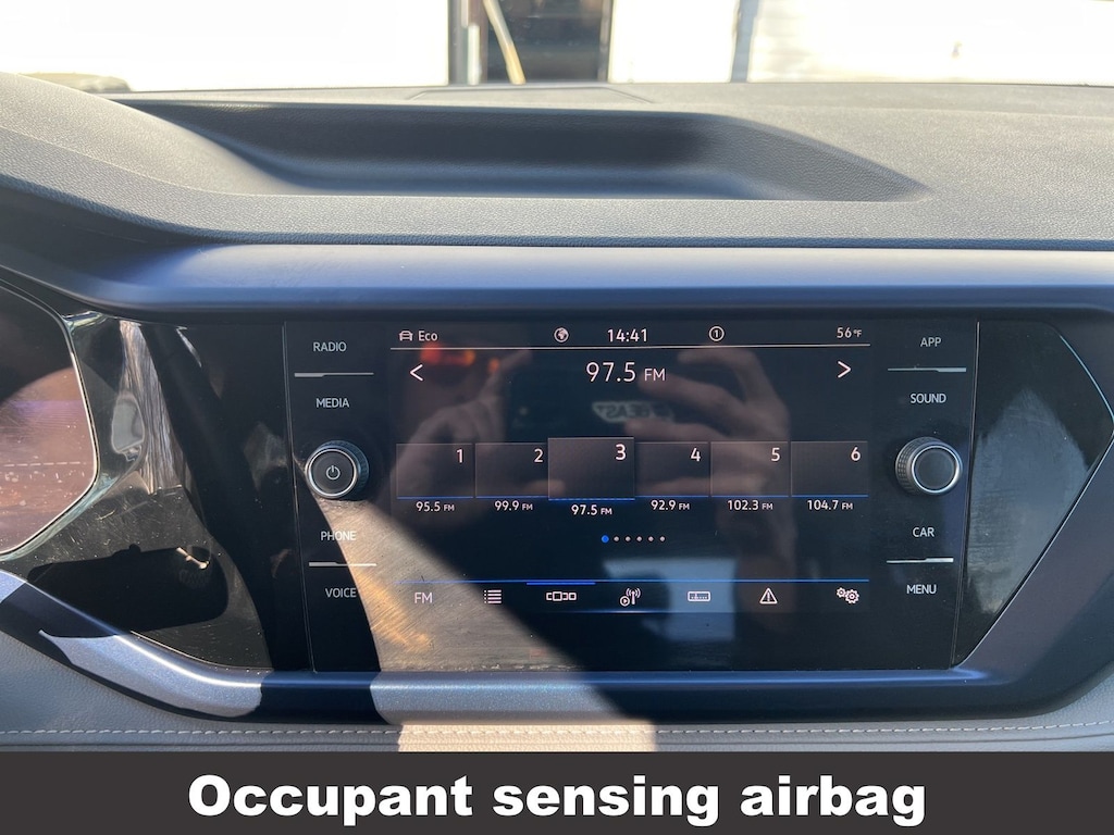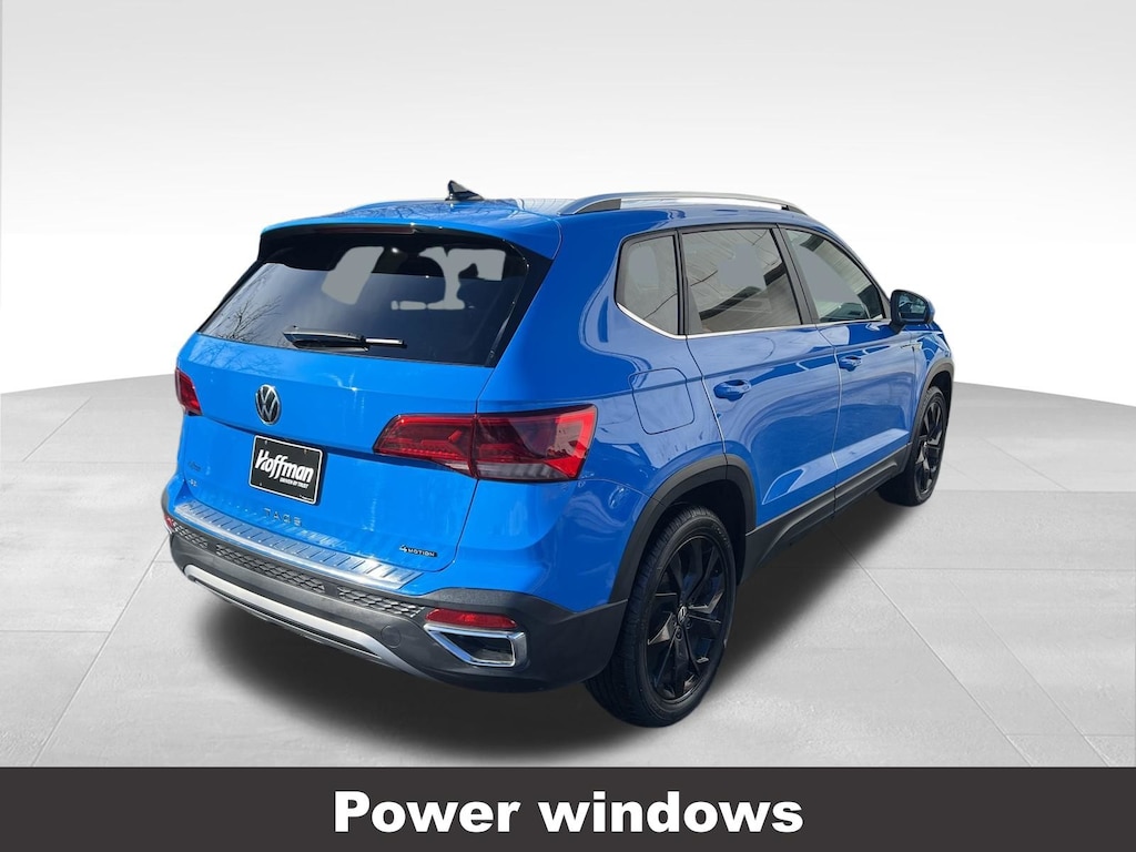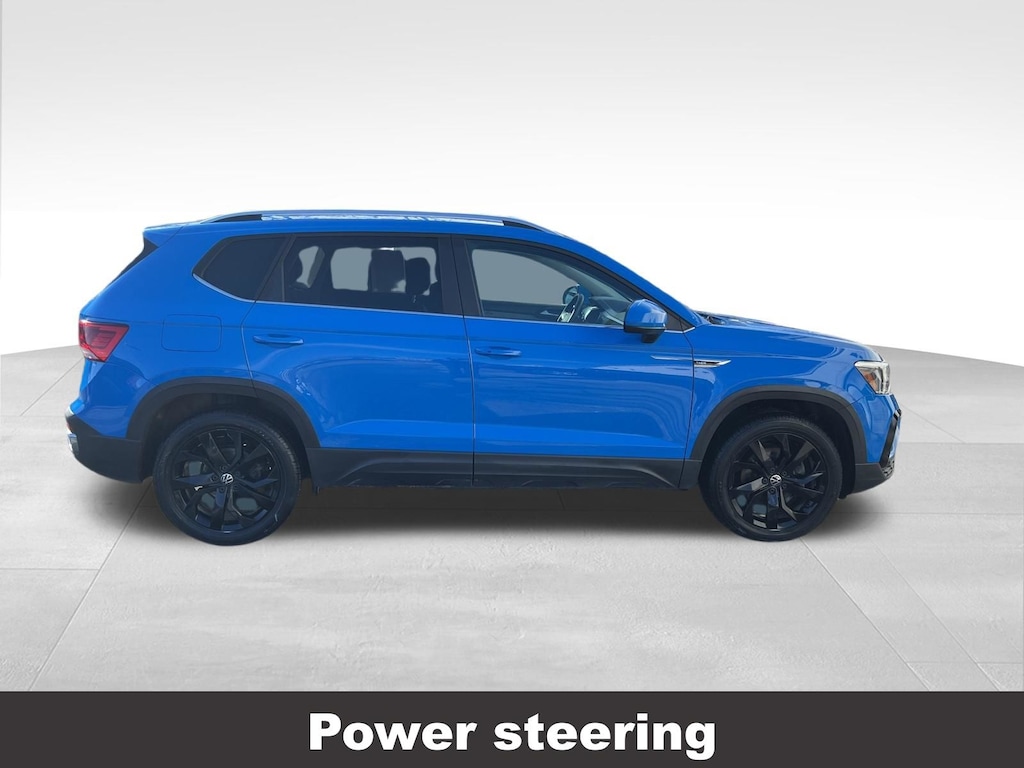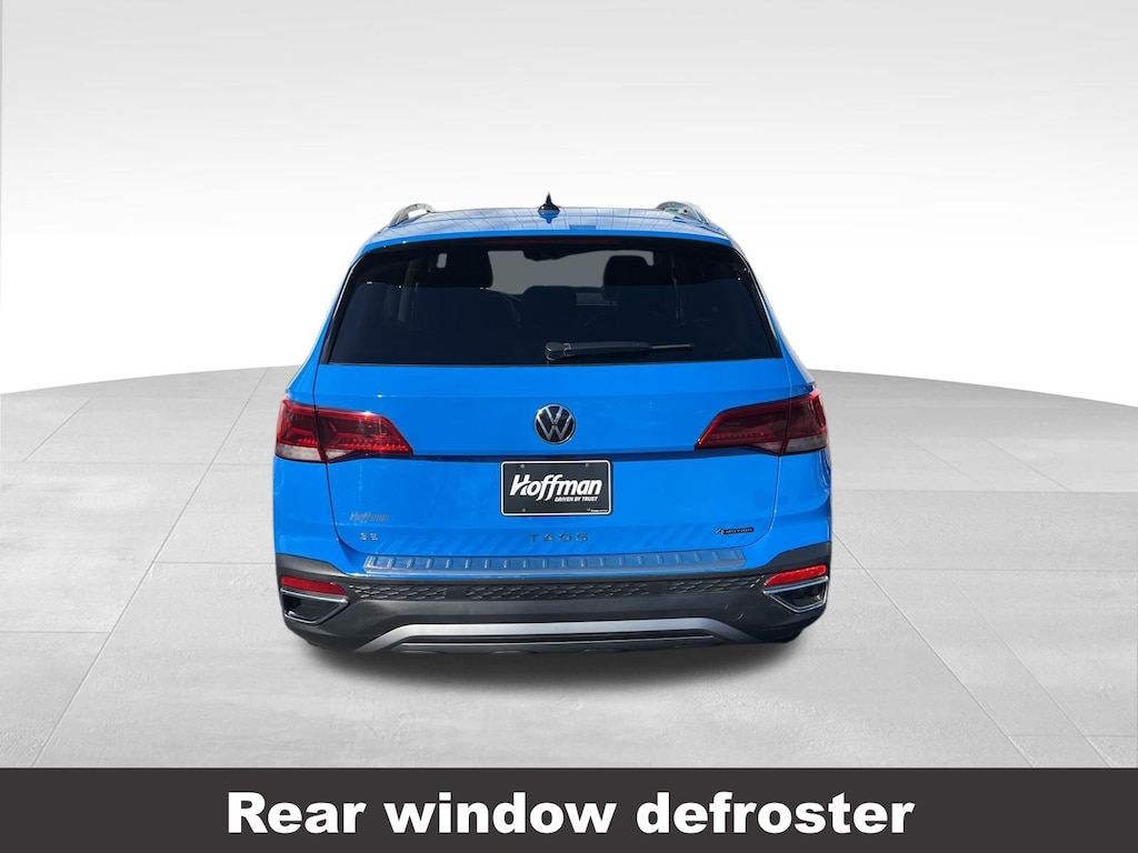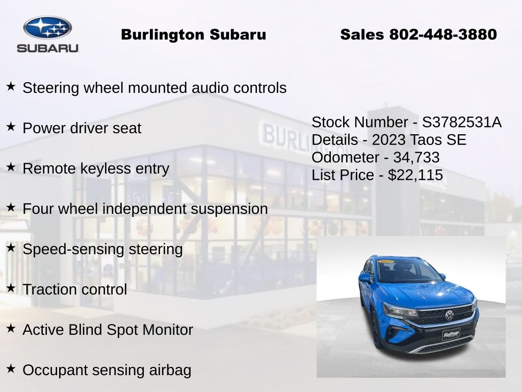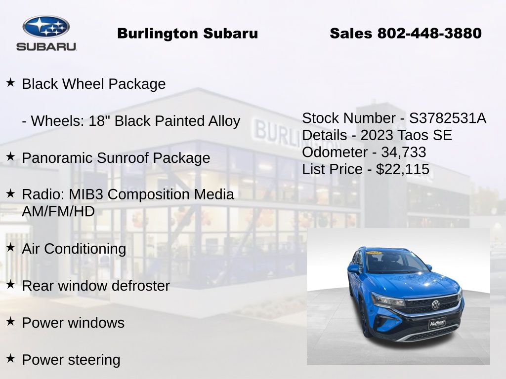 Clean CARFAX. Volkswagen Taos 1.5T SE 2023 4-Wheel Disc Brakes, ABS brakes, Active Blind Spot Monitor, Air Conditioning, Alloy wheels, Auto High-beam Headlights, Auto-Dimming Rearview Mirror (SRV), Black Wheel Package, Brake assist, Compass, Delay-off headlights, Driver vanity mirror, Dual front impact airbags, Dual front side impact airbags, Electronic Stability Control, Emergency communication system: VW Car-Net Safe & Secure 5-year, Exterior Parking Camera Rear, Four wheel independent suspension, Front reading lights, Front Strut Rear Multi-Link Suspension, Fully automatic headlights, Heated door mirrors, Heated Front Comfort Seats, Heated steering wheel, Illuminated entry, Leather Shift Knob, Low tire pressure warning, Occupant sensing airbag, Outside temperature display, Overhead airbag, Panic alarm, Panoramic Sunroof Package, Passenger vanity mirror, Power door mirrors, Power driver seat, Power steering, Power windows, Radio: MIB3 Composition Media AM/FM/HD, Rain sensing wipers, Rear window defroster, Rear window wiper, Remote keyless entry, Speed control, Speed-sensing steering, Split folding rear seat, Steering wheel mounted audio controls, Tachometer, Telescoping steering wheel, Tilt steering wheel, Traction control, Trip computer, Variably intermittent wipers, Wheels: 18" Black Painted Alloy.